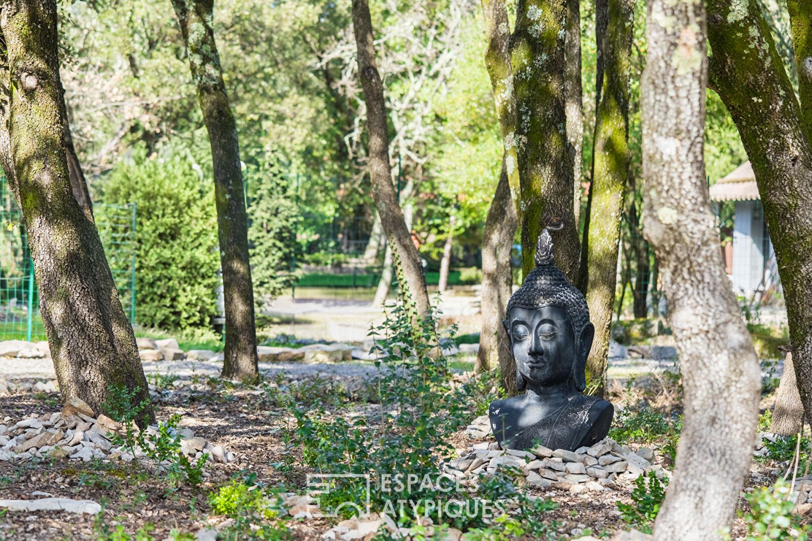Dans ce décor de garrigue, le regard est immédiatement attiré par un étang bordé de végétation, animé par une fontaine. Véritable pièce maîtresse du jardin, il confère à l’ensemble une atmosphère paisible.