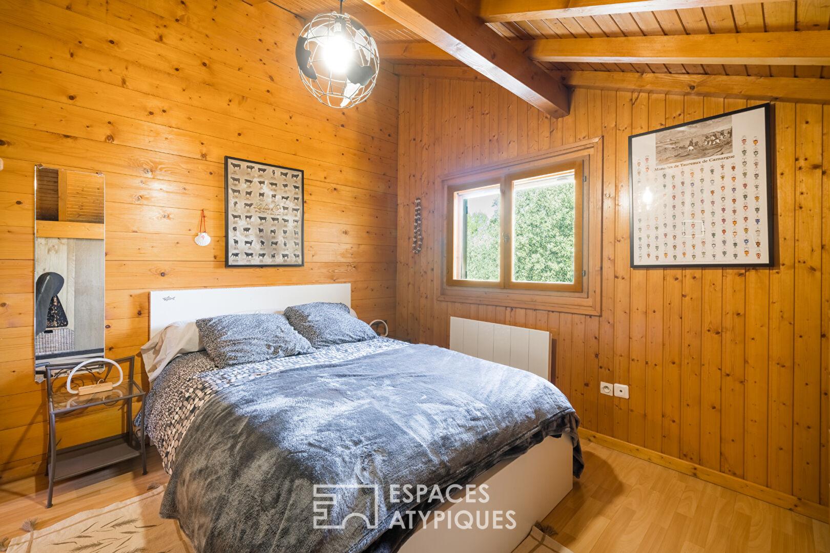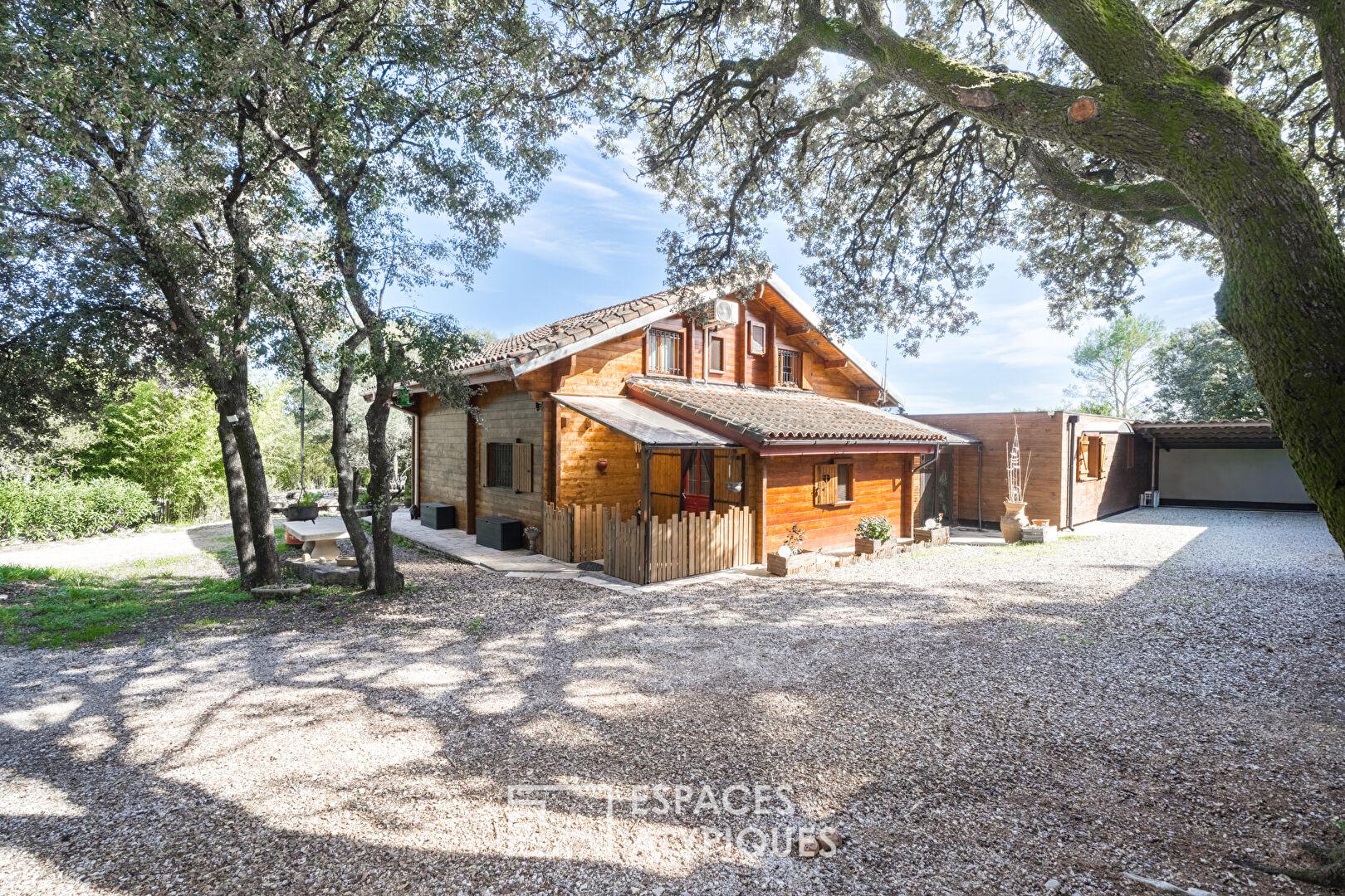Derrière son portail coulissant motorisé, l’ouverture révèle une surprise inattendue : un chalet en bois à l’esprit nature qui tranche élégamment avec l’architecture méditerranéenne environnante.