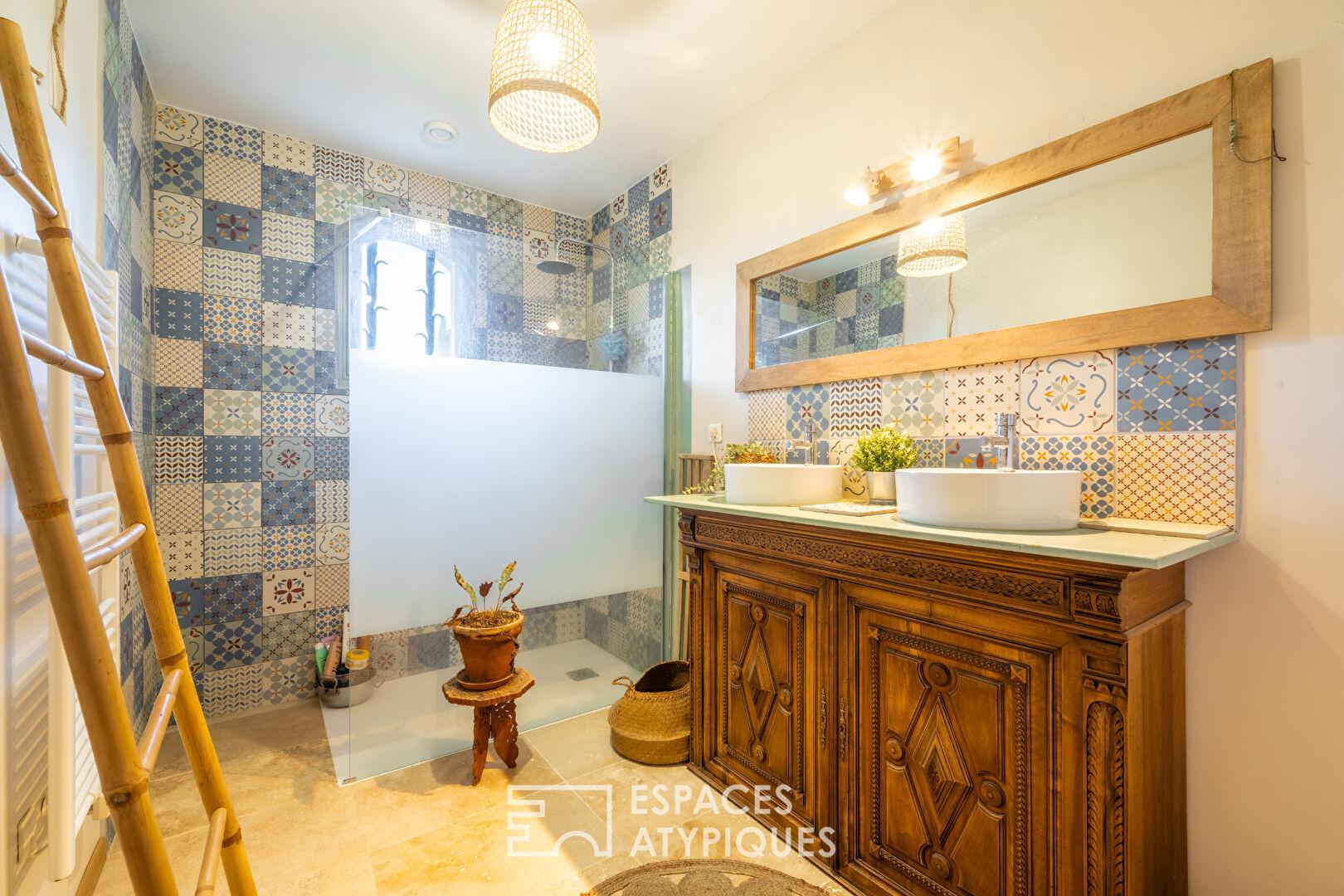 Le charme opère jusque dans les salles d’eau, où d’anciens meubles chinés ont été élégamment customisés en plans vasque.