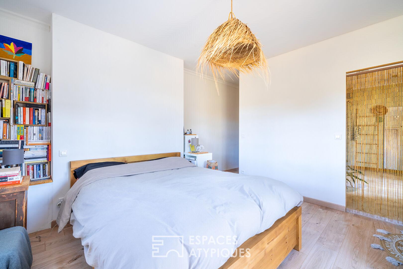 La suite parentale de 31 m², véritable belvédère bohème, s’ouvre sur un balcon exposé sud.