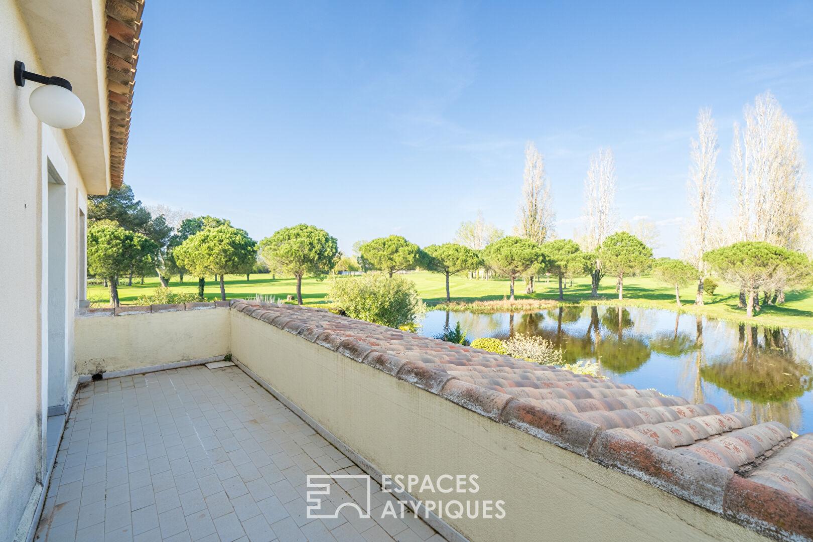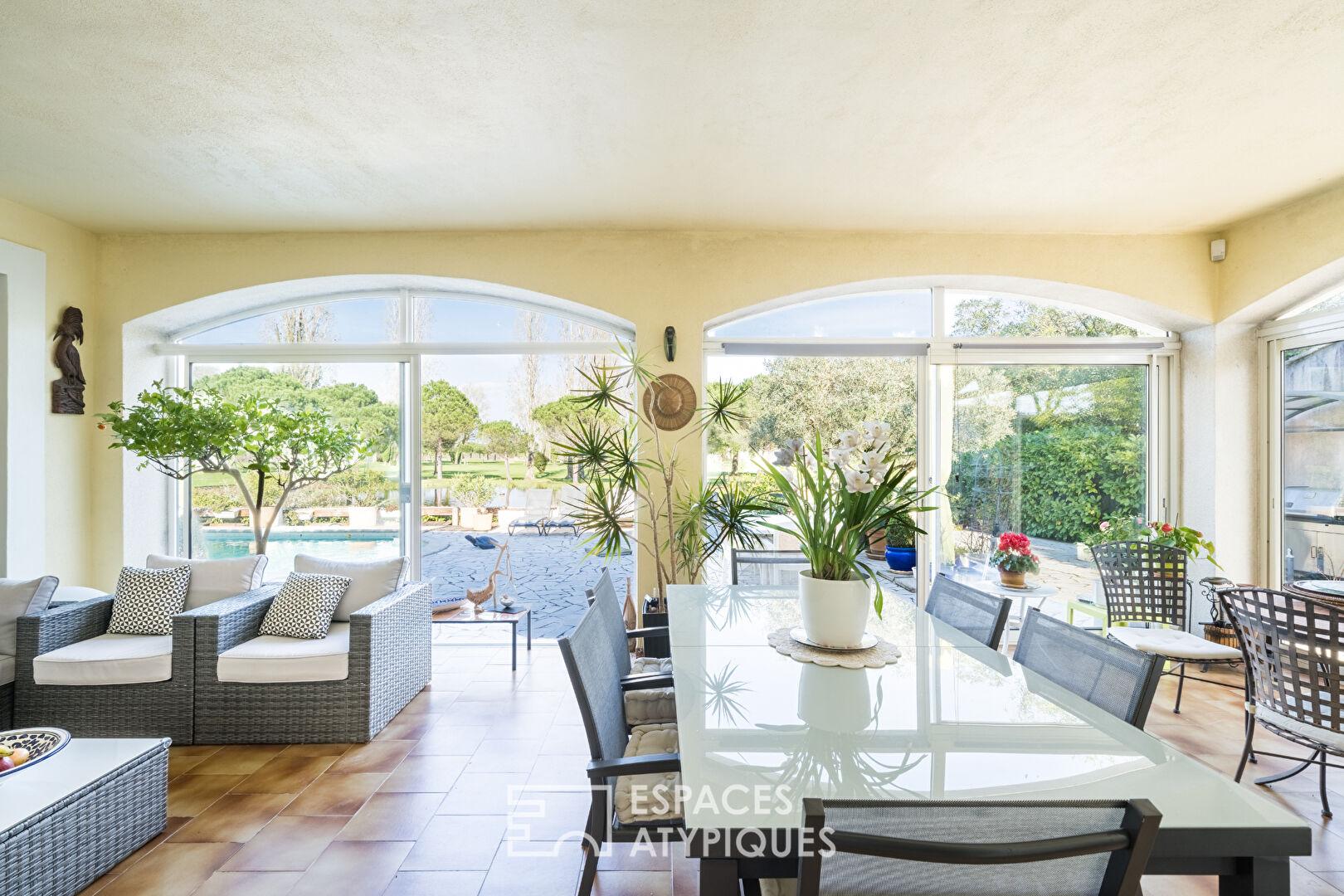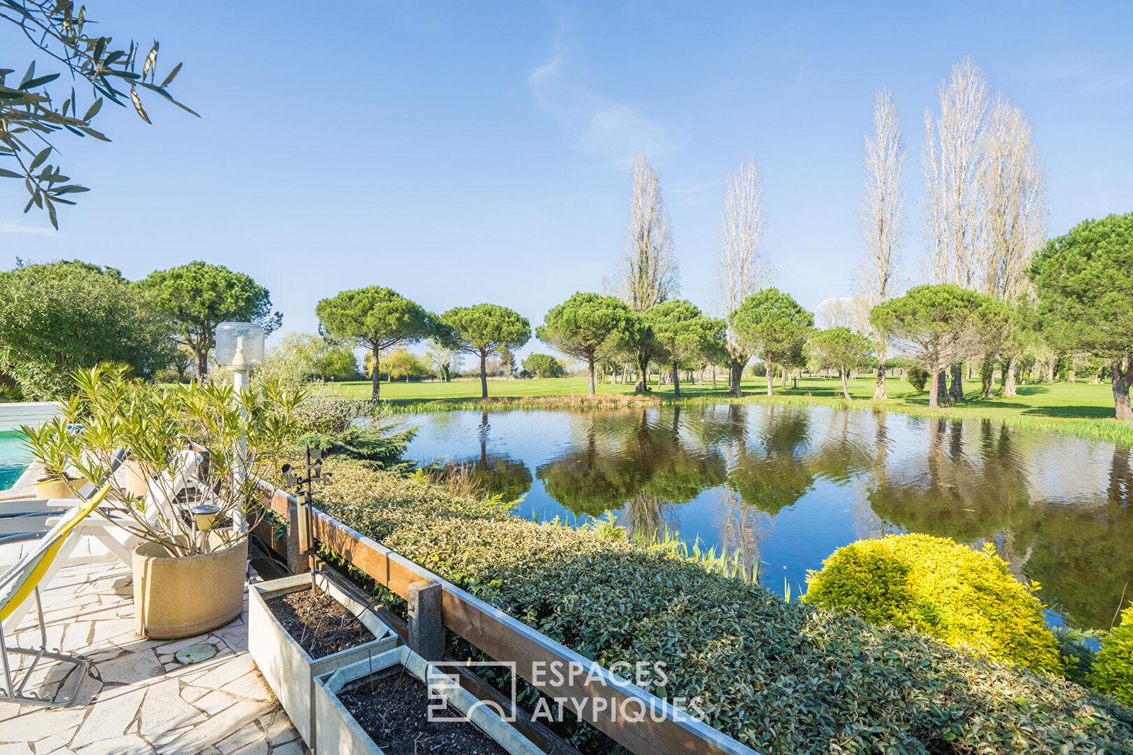 À l’extérieur, le jardin s’organise autour d’une piscine de 11 x 5 mètres, parfaitement intégrée au paysage et ouverte sur la vue golf, créant un véritable espace de détente.