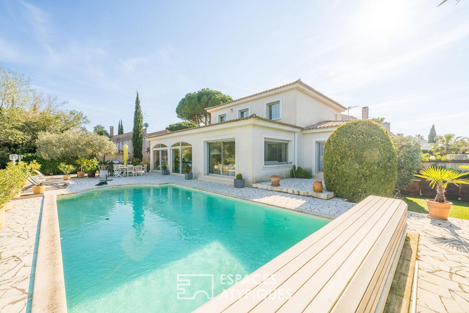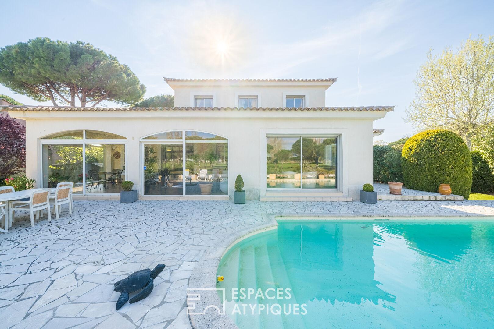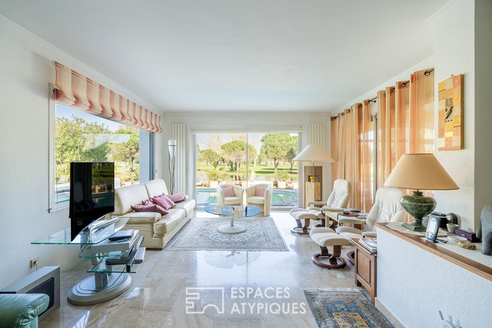 En bordure directe du Golf, cette villa de 225 m² déploie ses volumes sur un terrain paysager de 762 m² avec piscine, dans un environnement privilégié alliant calme, vue dégagée et art de vivre.
