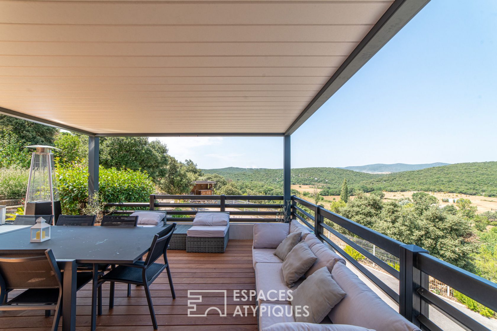 Cette propriété contemporaine récente (normes RT 2012) constituée de deux maisons indépendantes d’une surface totale d’environ 278 m2 s’est installée à quelques minutes de Montpellier en position dominante dans un environnement naturel magnifique.