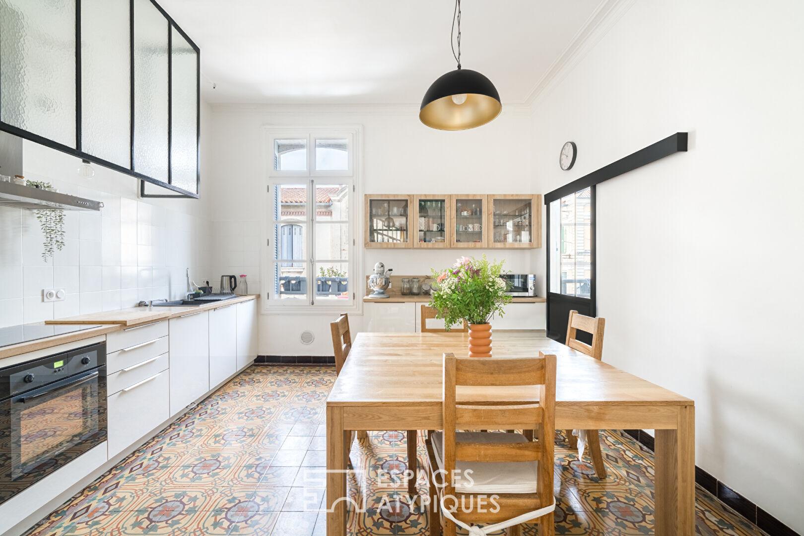 Situé au premier étage d’un immeuble en centre-ville de Lunel, à seulement quelques minutes à pied de la gare, cet appartement de 130 m² offre de beaux volumes et une luminosité remarquable.