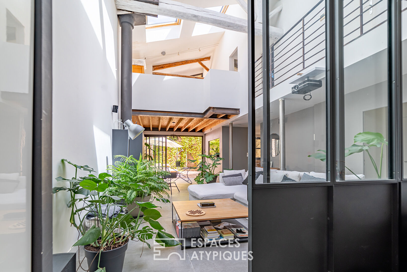 A l’intérieur, un lieu de vie cocooning avec une vue directe sur un patio aménagé et l’accès au jardin derrière deux anciennes portes d’époque.