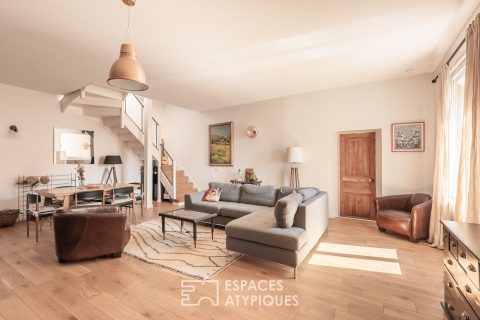 La montée de l’escalier donne accès à l’étage composé d’un second séjour aménagé en salle de réception avec bar et d’une chambre avec dressing, salle d’eau privative et wc séparés. Cette pièce donne sur une superbe terrasse de 40m2 offrant une vue panoramique sur les toits de Béziers, la Cathédrale Saint-Nazaire et les Pyrénées. Il sera même possible d’apercevoir la mer au loin.