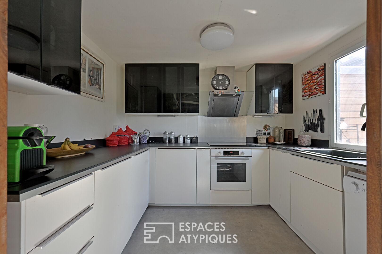 L’intérieur surprend agréablement par sa conception audacieuse. Les trois grands volumes principaux, véritables cocons de vie, desservent une myriade de petits modules, permettant à chacun d’agencer l’espace selon ses besoins et ses envies.