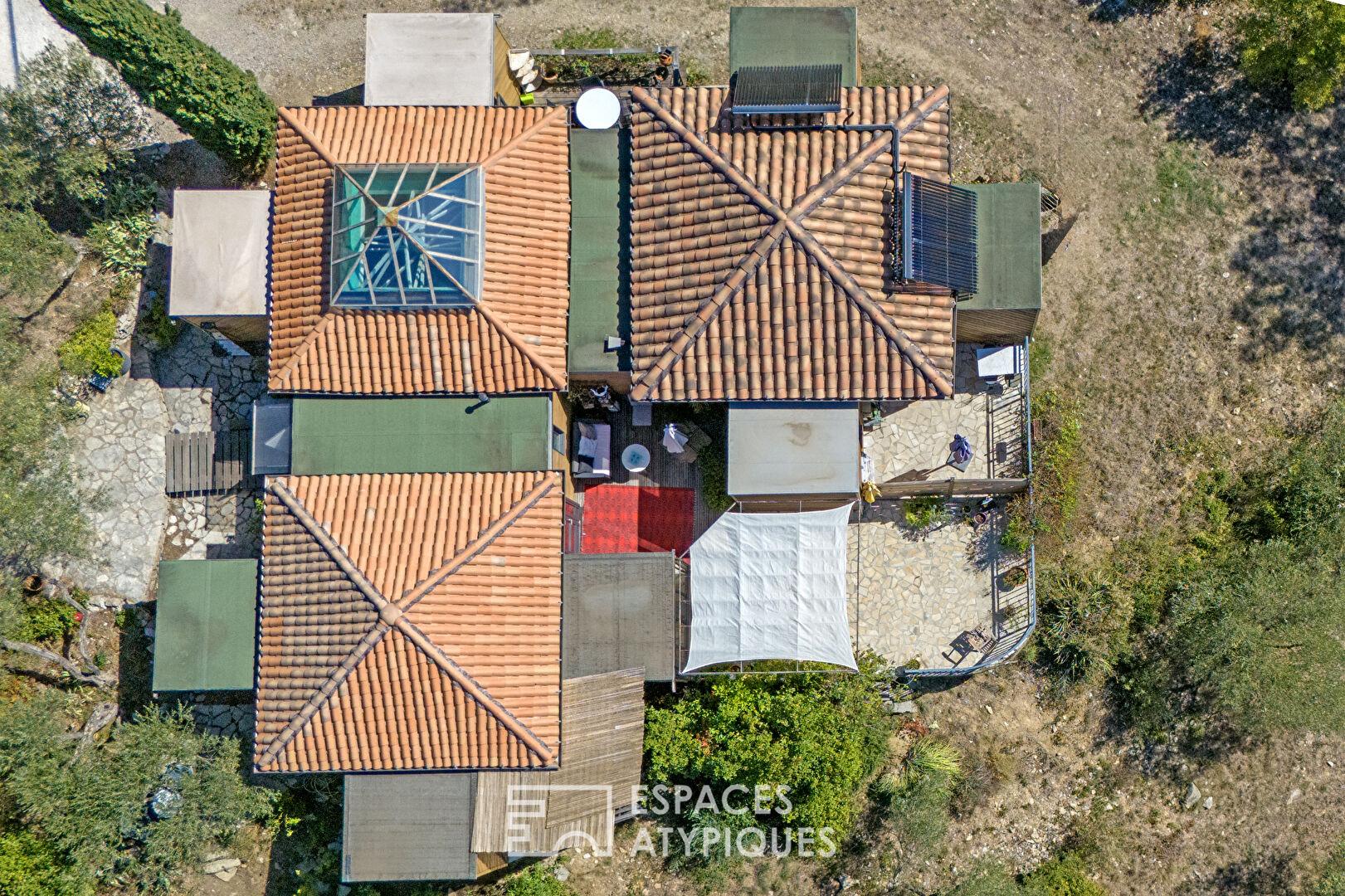 Le captage des eaux de pluie pour l’arrosage et les panneaux solaires pour l’eau chaude et le chauffage au sol soulignent la conception écologique du bien.