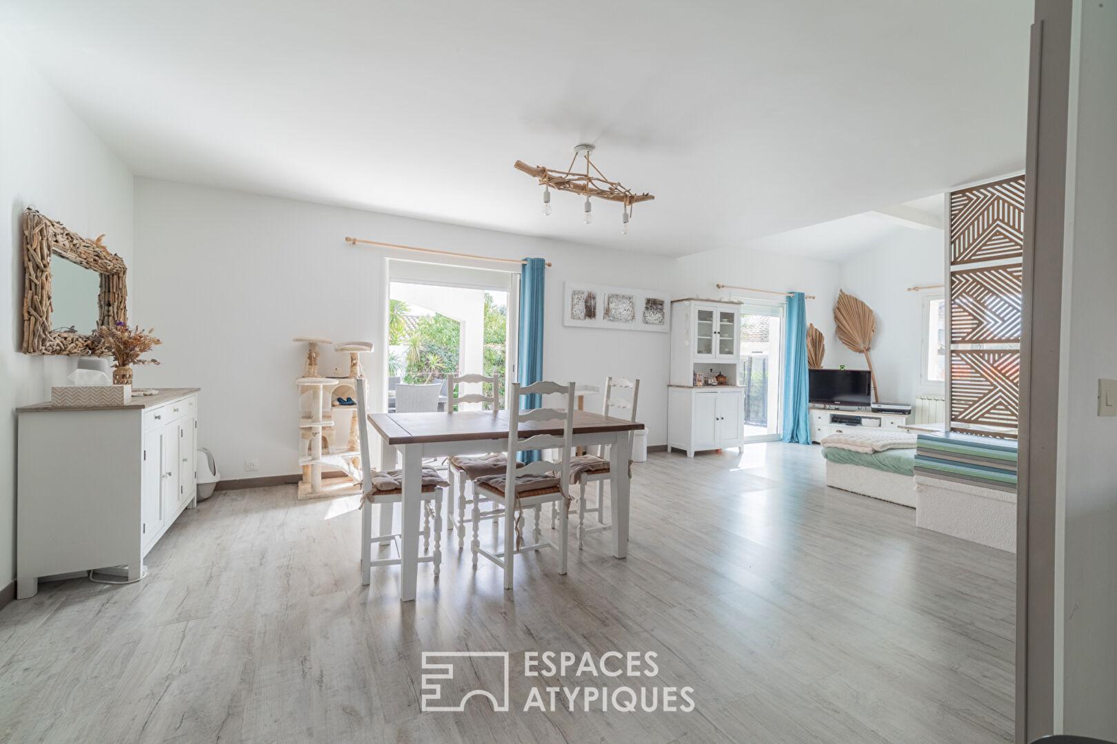 Des baies vitrées à galandage prolongent l’espace vers la terrasse et la piscine, offrant une circulation fluide entre intérieur et extérieur et une belle luminosité tout au long de la journée.