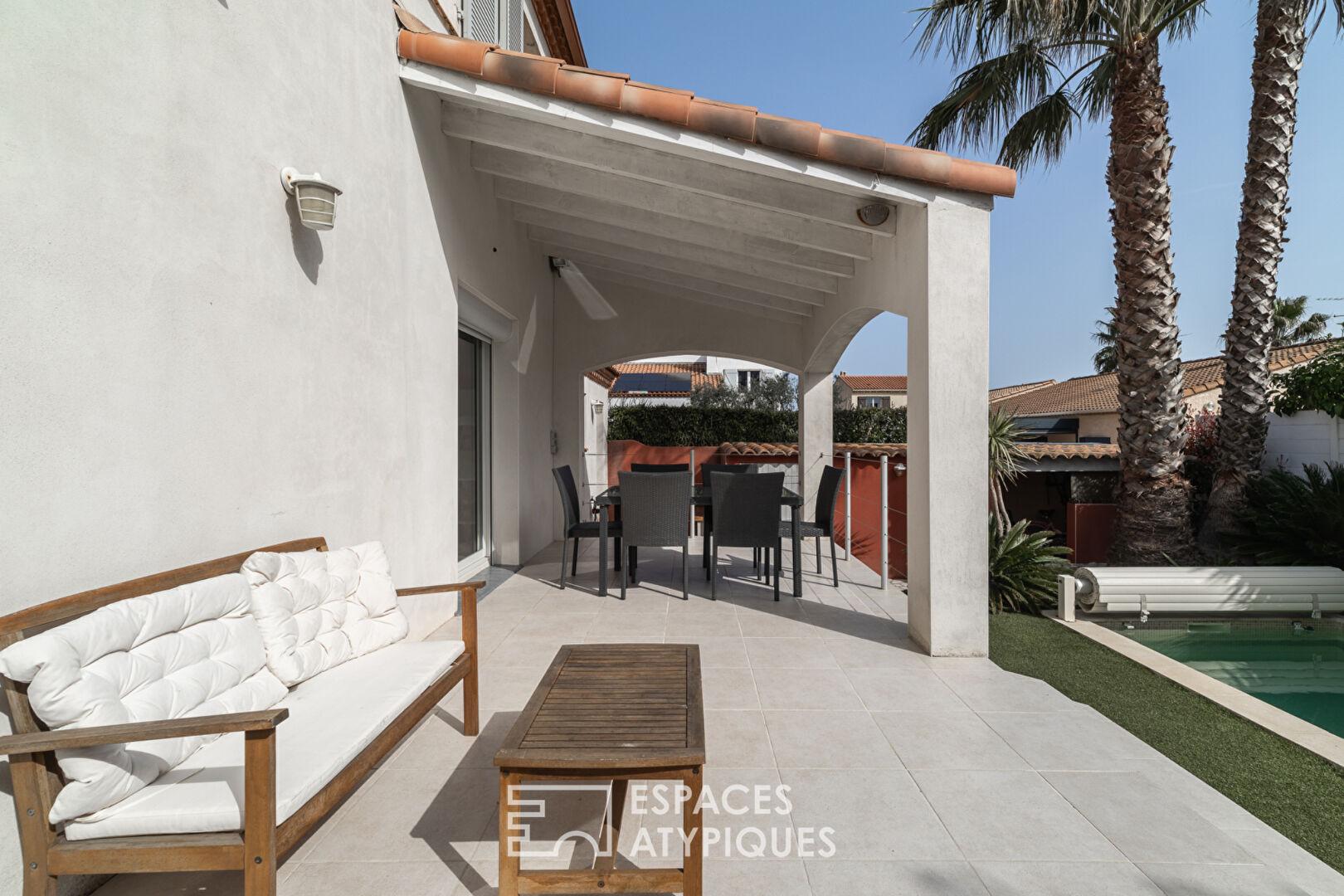 Située à Villeneuve-lès-Maguelone, à proximité de la mer et au cœur d’un environnement résidentiel particulièrement calme, cette maison individuelle développe 112 m² habitables pour environ 130 m² au sol, implantée sur un terrain de 360 m² sans vis-à-vis.