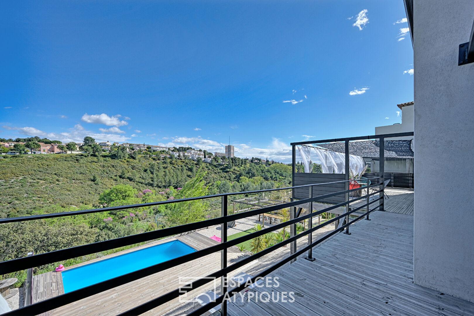 Dès l’entrée, l’espace impressionne. Le vaste séjour cathédrale, baigné de lumière naturelle, grâce à de larges baies vitrées à galandage, s’ouvre sur une terrasse suspendue, véritable balcon sur la garrigue. Ici, l’horizon est un tableau vivant, changeant au gré des heures et des saisons.