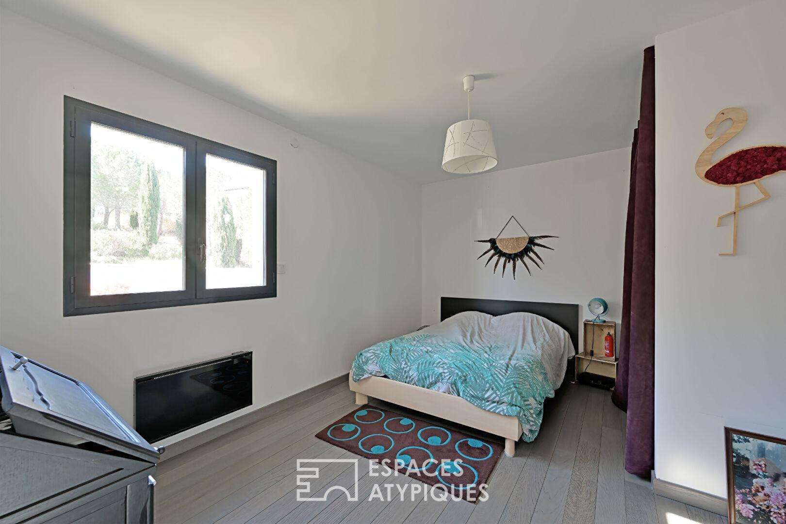 Édifiée en 2014 sur un terrain de prés de 1000m², cette propriété de 208 m² habitables, conjugue avec élégance modernité, lumière et nature. Ses lignes épurées épousent la pente du terrain pour offrir, depuis chaque pièce, des perspectives ouvertes sur un paysage méditerranéen de garrigue.