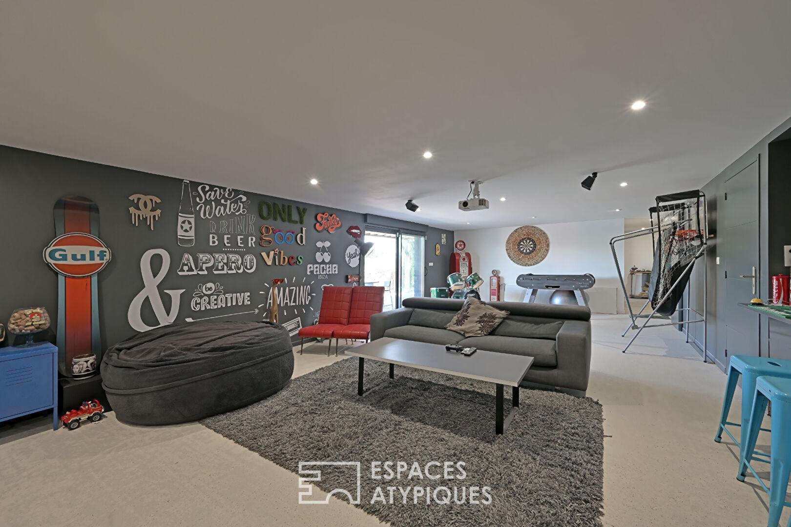 Au rez de jardin, un bureau, une grande salle de jeux avec accès direct au jardin, et une buanderie, viennent parfaire le confort de vie.