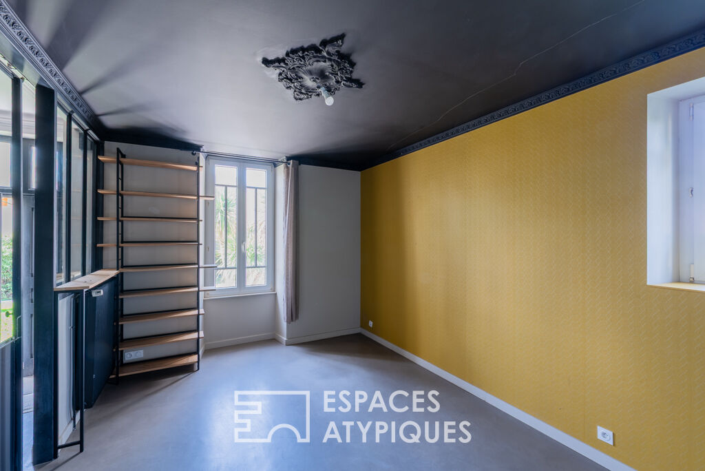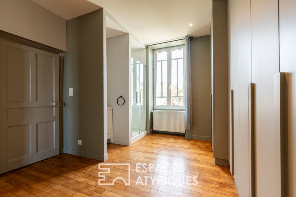 Dès l’entrée, l’ambiance se dévoile : moulures discrètes, hauteurs sous plafond généreuses, parquet massif et jeux de lumière structurent les pièces de vie. Le salon et la salle à manger dialoguent avec fluidité, portés par une circulation pensée pour le quotidien. En léger contrebas, une extension d’époque accueille une cuisine dînatoire, aux finitions épurées, rehaussée d’une verrière industrielle côté salon baignée de lumière par ses nombreuses ouvertures vers l’extérieur. En retrait, une suite master avec salle de bains, douche et dressings sur mesure propose un espace nuit parfaitement indépendant. Cette dernière, accessible de manière autonome, se prête aisément à l’accueil d’invités ou à une activité de location courte durée.