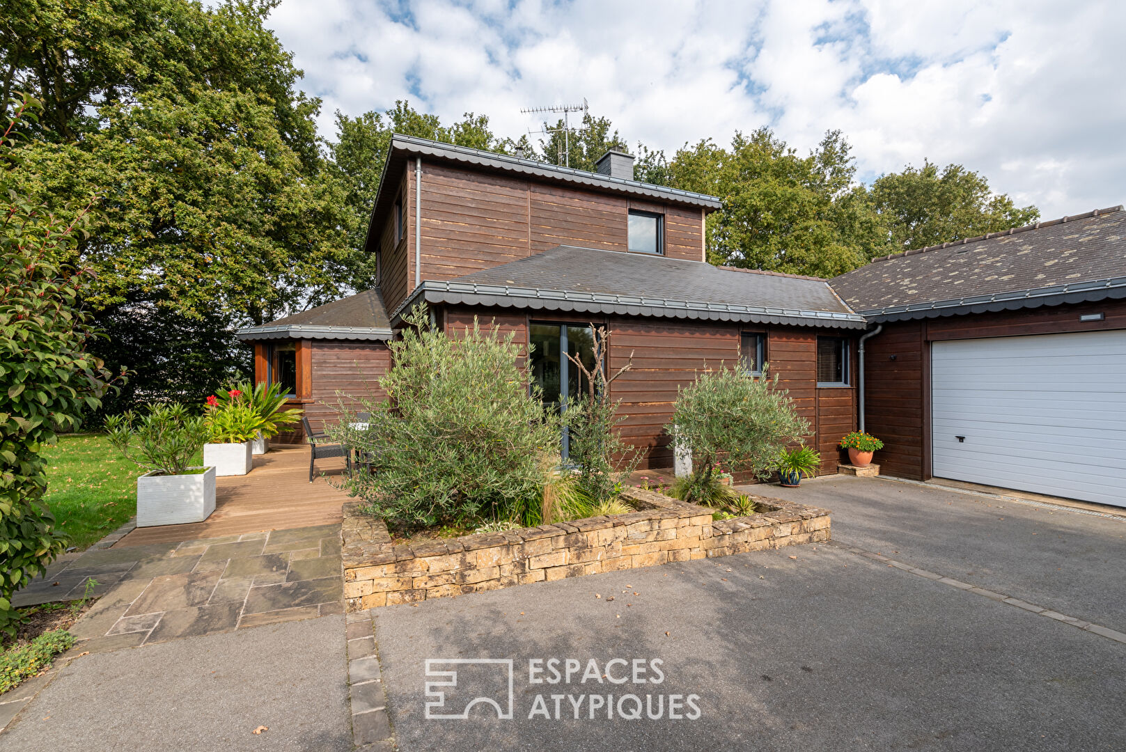 À mi-chemin entre les villes dynamiques de Janzé et Bain-de-Bretagne, en lisière d’un charmant bourg de campagne, cette maison de charme principalement construite en bois avec des matériaux de qualité sur une belle parcelle arborée et paysagée de plus de 1700 m², développe une surface d’environ 140 m² sur deux niveaux.