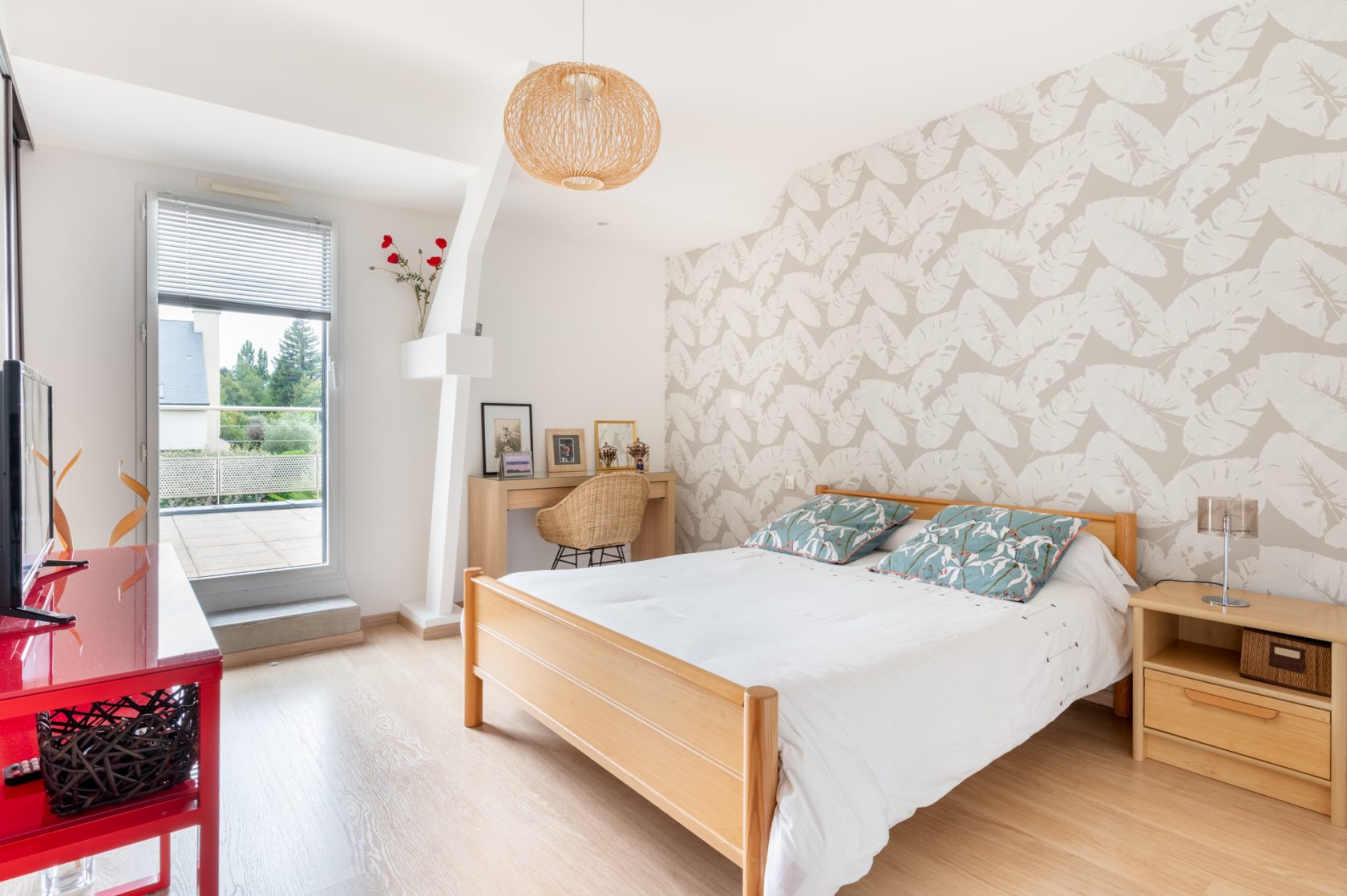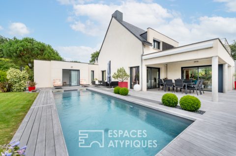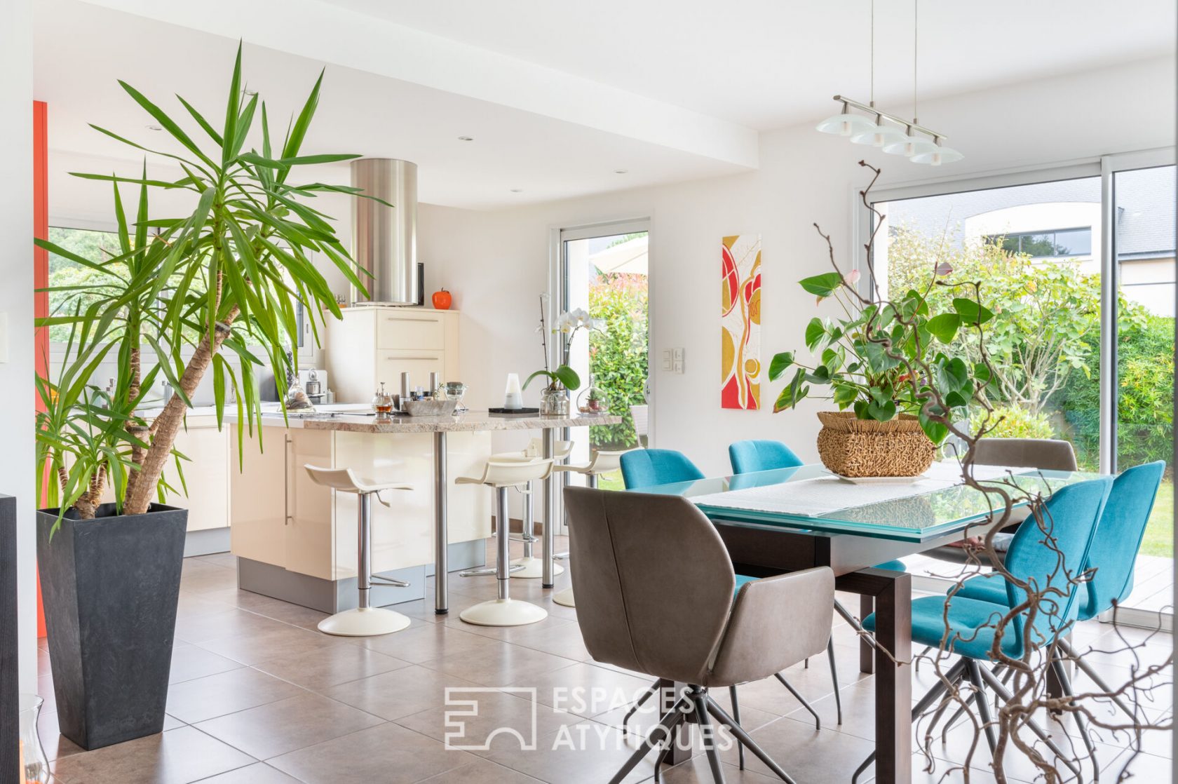 Située à quinze minutes de Rennes, cette confortable villa de 2007, articulée sur deux niveaux et ses 175 m², joue avec les volumes et la lumière grâce à sa remarquable exposition.