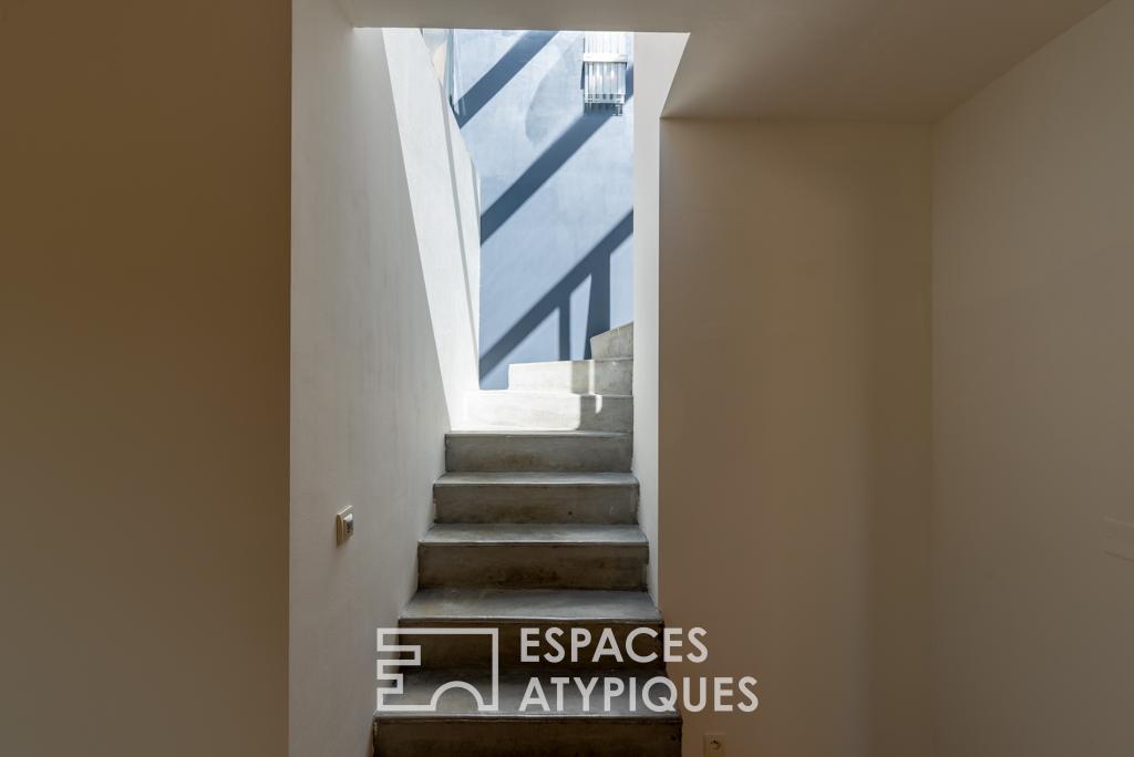 Le premier niveau, desservi par son entrée et un vestiaire, s’ouvre sur une généreuse pièce à vivre composée d’un espace salon séjour, un espace salle à manger ouvert sur la terrasse ainsi qu’une cuisine américaine aménagée et équipée, lingerie. La géométrie variable et les volumes de cette pièce lui offre fluidité et caractère. En retrait, deux chambres et une salle de bains.