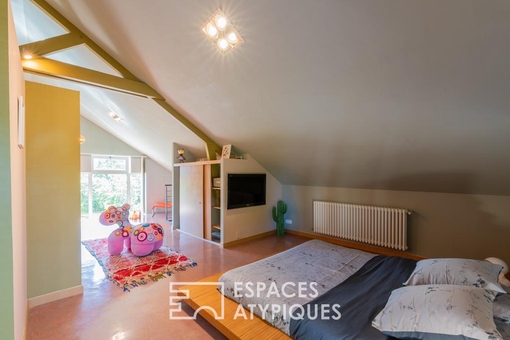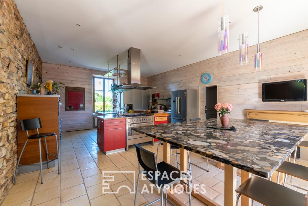 La demeure (318 M² habitables) présente une entrée et son escalier central, une vaste cuisine dînatoire familiale ouverte sur la grande terrasse exposée plein sud avec vue sur le jardin, un salon cosy et une chambre.