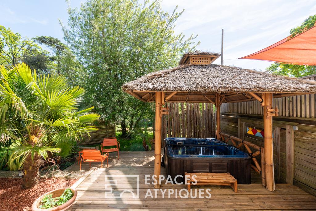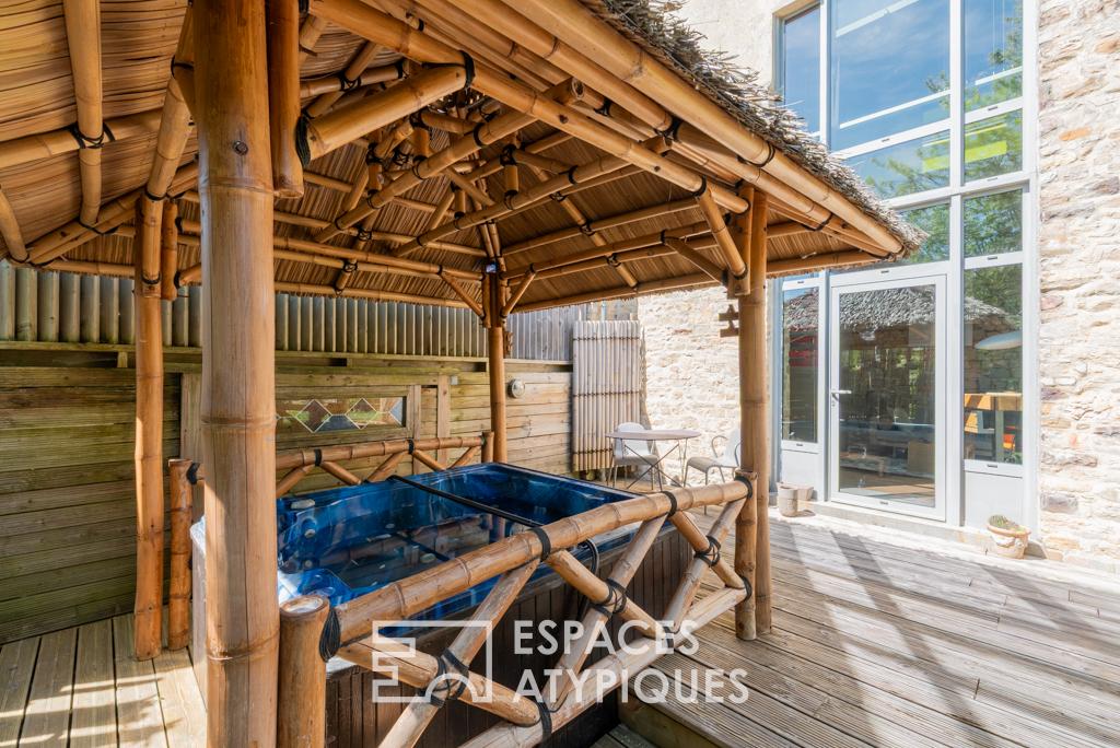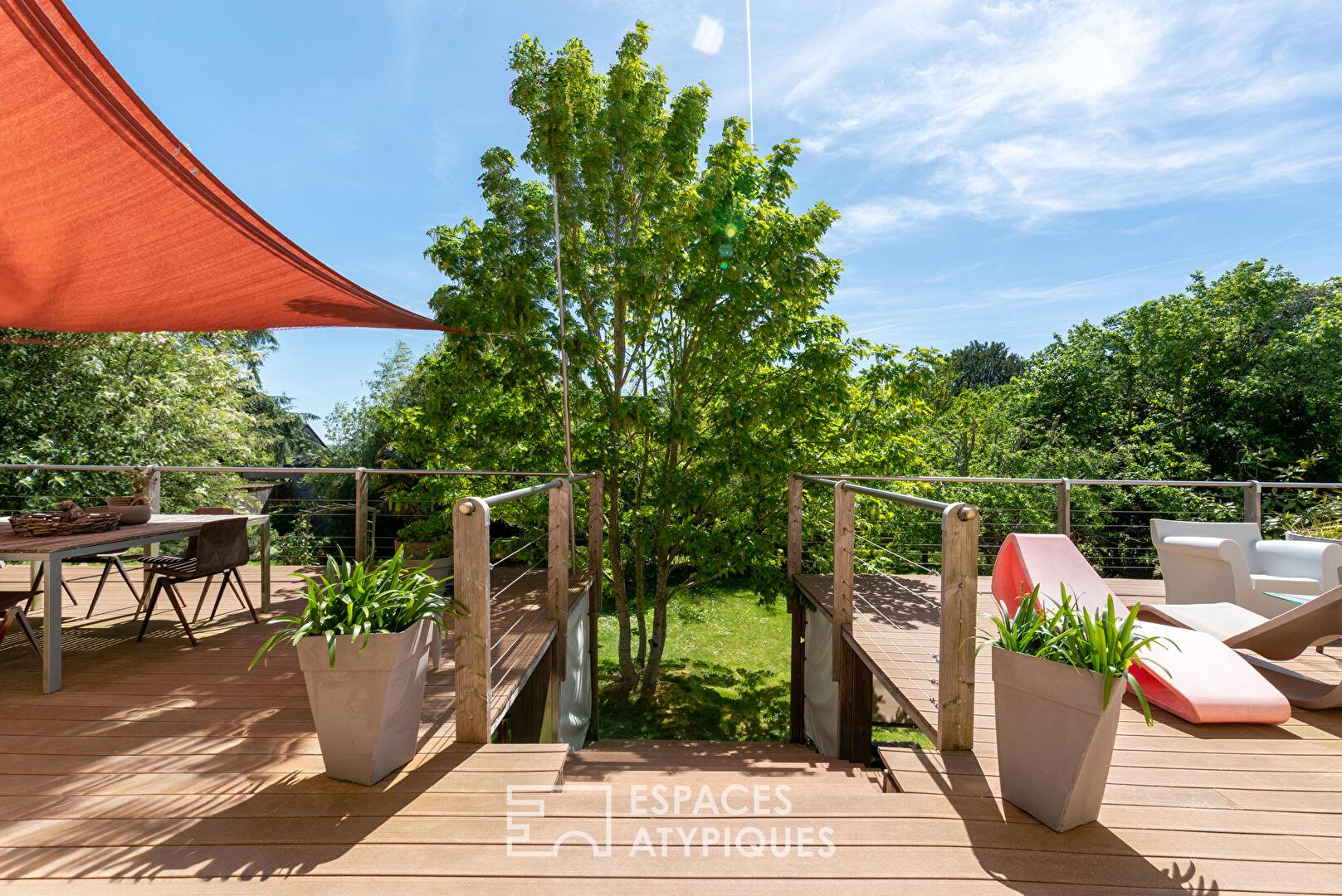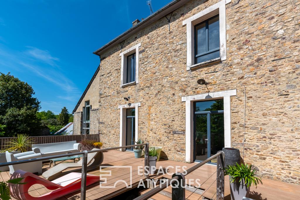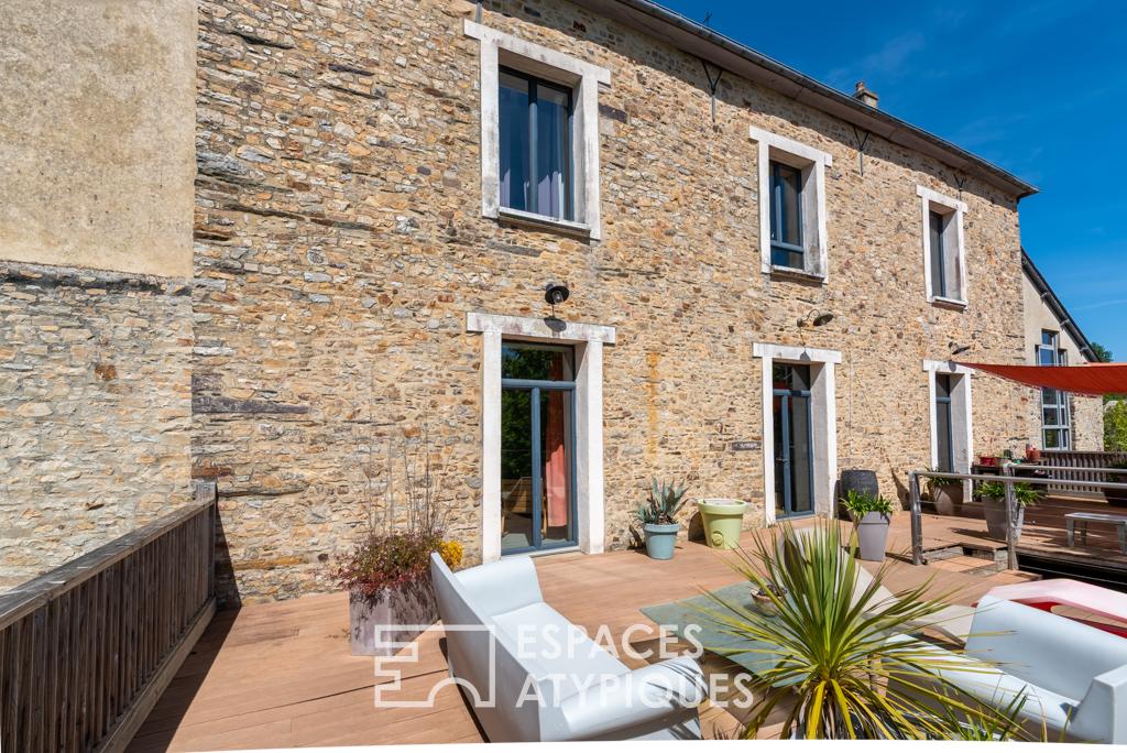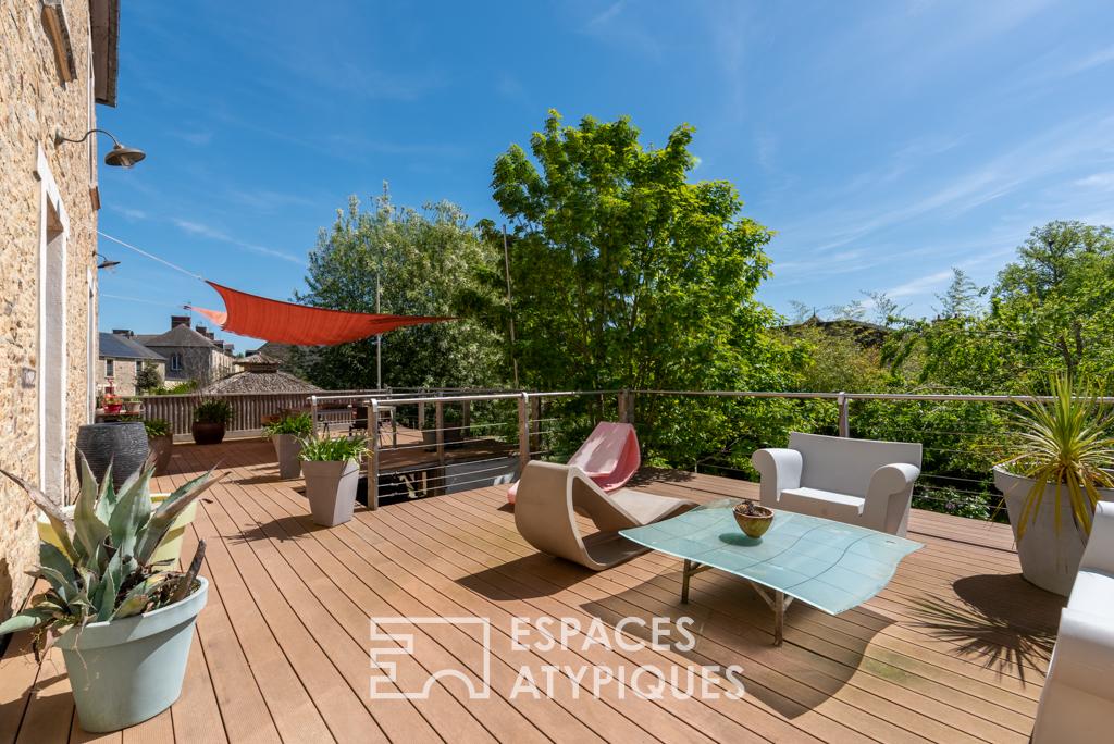 La vaste terrasse orientée sud qui domine le jardin et borde la demeure, prolonge les espaces de vie et offre une belle parenthèse poétique.