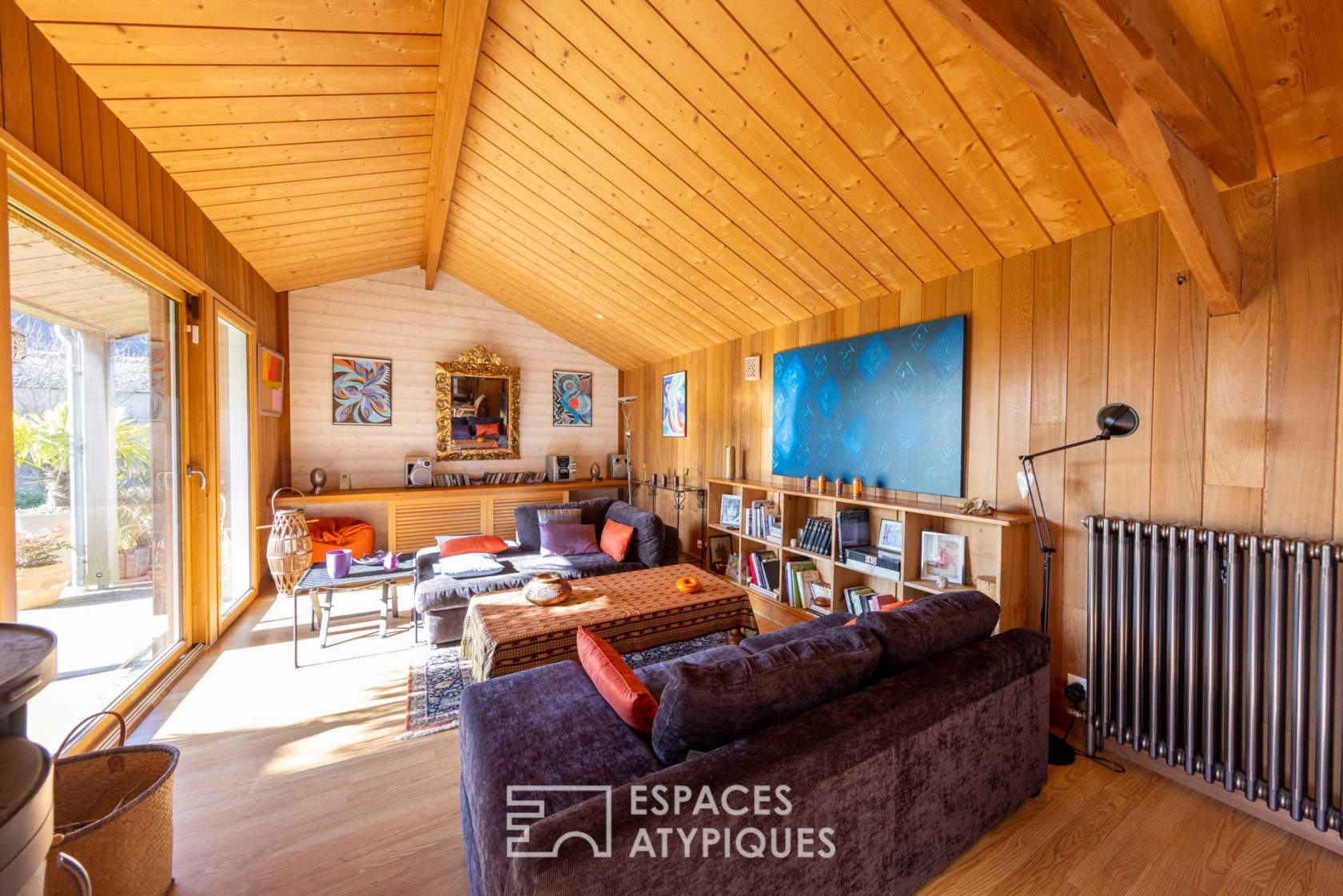 Avec ses 230 m² habitables et son jardin d’environ 400m² la maison se révèle de façon assez inattendue : une grande façade en bois sobre laisse place à l’intérieur à des pièces de vie qui s’égrènent comme un T : depuis le sud un bureau s’ouvre sur le salon et sa belle cheminée en briques. De part et d’autre de la salle à manger les pièces de vie s’articulent pour profiter au choix de la lumière de l’ouest ou du sud. La cuisine en recul est baignée de lumière grâce à sa verrière contemporaine. La circulation est fluide et harmonieuse dans cette maison atypique avec de tout évidence une âme bien à elle.