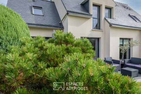 Le premier niveau s’ouvre sur une entrée qui dessert un salon et un séjour totalisant 47m², et bénéficie d’une belle luminosité grâce à son exposition sud. Une cuisine semi-ouverte aménagée et équipée aux lignes épurées jouxte le séjour. Côté extérieur, un jardin paysagé laisse présager de bons moments en famille.
