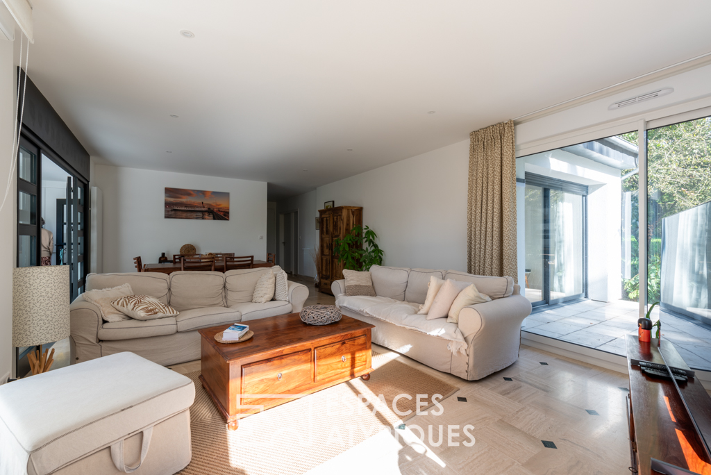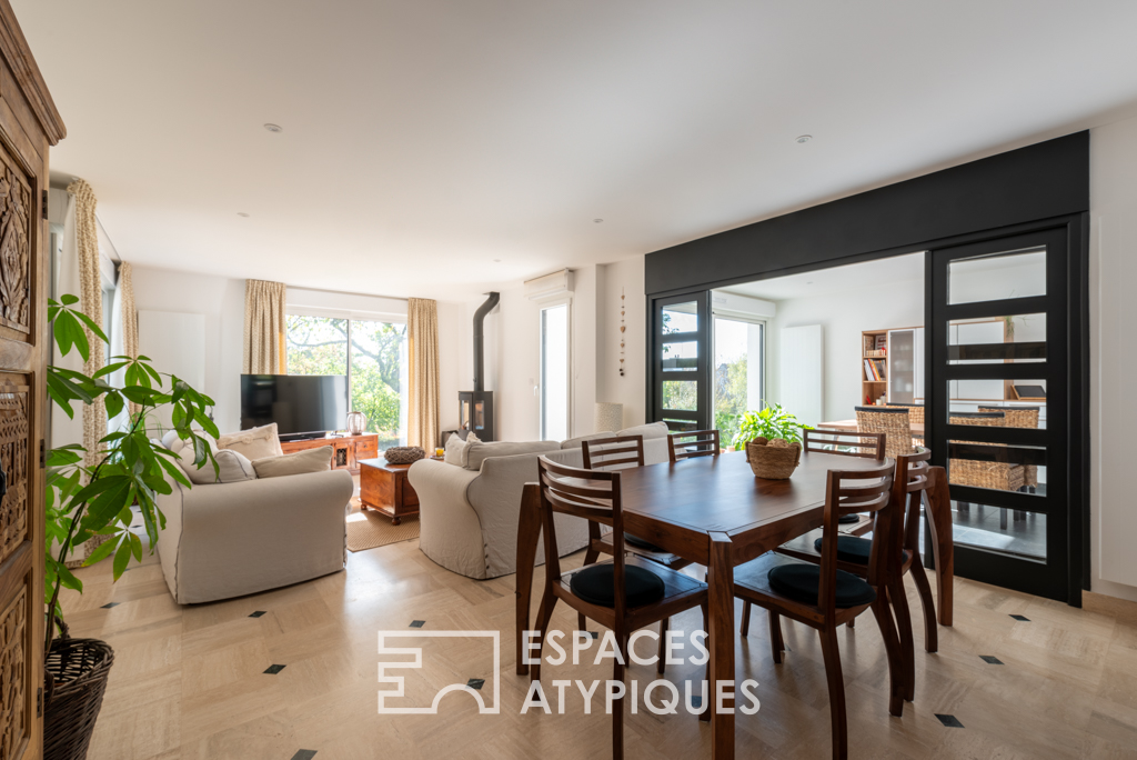 Située au coeur de Cesson-Sévigné et à quelques minutes du centre de Rennes, cette vaste familiale au design affirmé intégralement rénovée en 2022, profite d’un environnement particulièrement calme et paysagé.