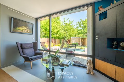 Son entrée, lumineuse et authentique, ouvre sur le salon – salle à manger bénéficiant d’une belle terrasse offrant un cadre verdoyant. La cuisine et les salles d’eau sont de très belle facture et liées d’harmonie avec l’ensemble de la maison. Une superbe suite parentale récente, réalisée avec des matériaux haut de gamme et sur mesure, de plus de 40m², baignée de lumière s’ouvre sur une terrasse et sa piscine swim n’spa telle une superbe suite privée d’hôtel.