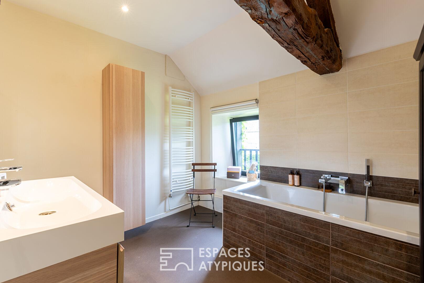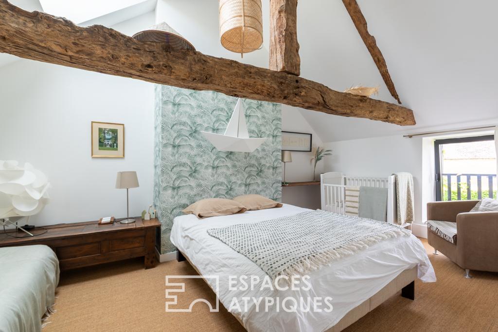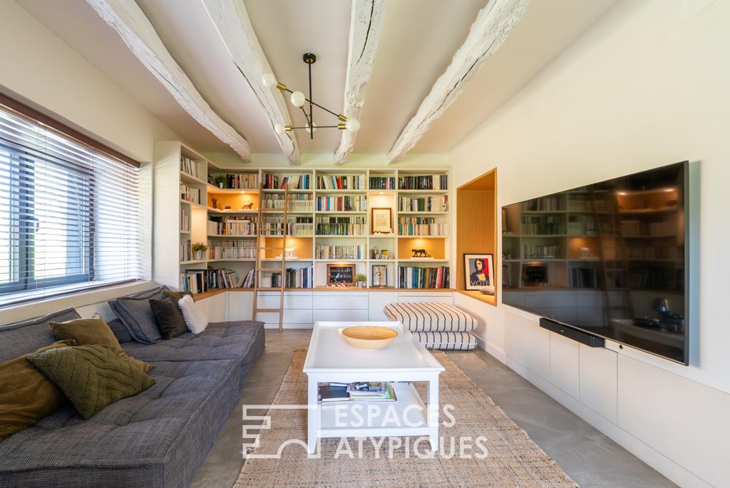 Dès l’entrée, le charme opère grâce aux matériaux préservés telle que la tomette. La lumière s’invite généreusement, révélant des volumes harmonieux où se mêlent avec justesse authenticité et modernité : poutres anciennes et prestations contemporaines dialoguent avec élégance.