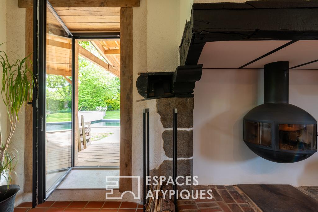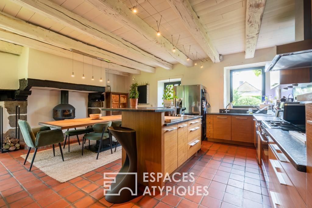 La cuisine, véritable lieu de convivialité, avec sa cheminée et son poêle, donne accès à la terrasse ainsi qu’à un salon cosy sous le préau permettant de se prélasser au bord de la piscine.