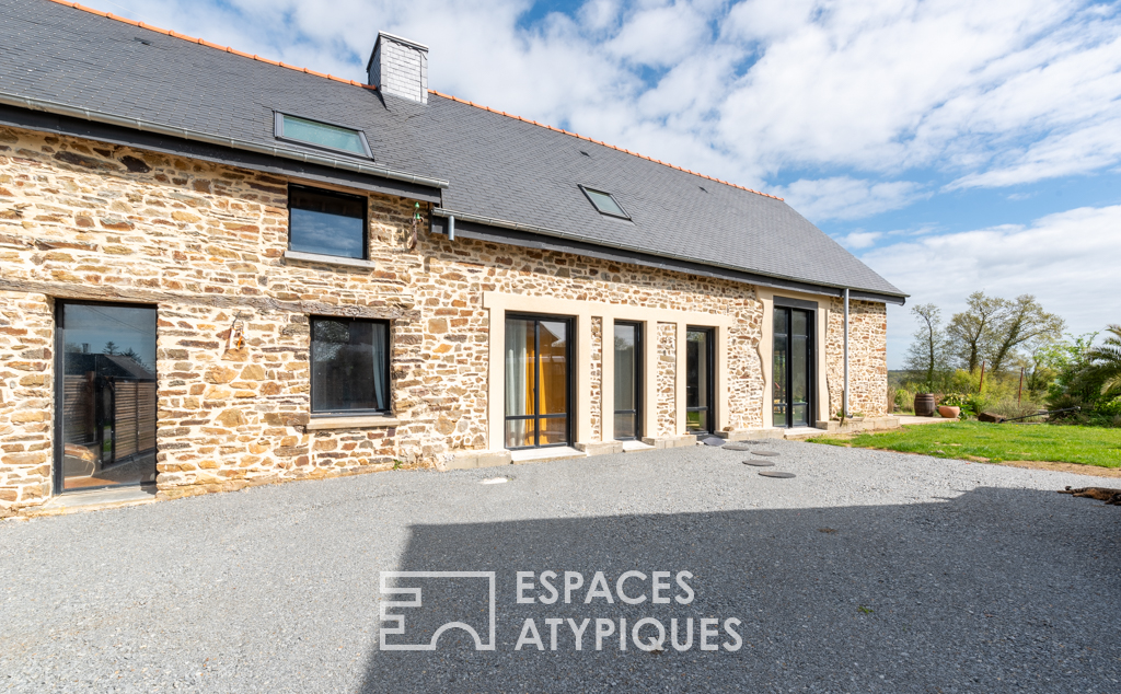Situé à quelques minutes de Guichen et à vingt-cinq minutes de Rennes, découvrons ce sobre corps de ferme de 170 m², rythmé par ses larges ouvertures design et son plafond cathédrale singulier, un charme fou !