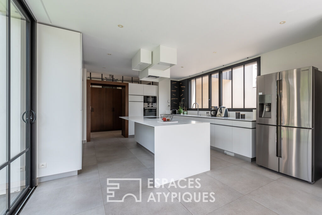 Si la structure initiale de cette imposante bâtisse du début du XXème a été préservée, l’architecte a redessiné avec une grande créativité l’intégralité des volumes afin de lui garantir des perspectives originales et une belle fluidité de circulation. Avec sobriété et légèreté, il a su orchestrer et enrichir les jeux de matière. Sans nul doute, il a travaillé la lumière afin d’offrir un sentiment de bien-être à ce remarquable lieu de vie qui, malgré ses volumes hors-normes, reste particulièrement convivial et présente de nombreux espaces intimes.