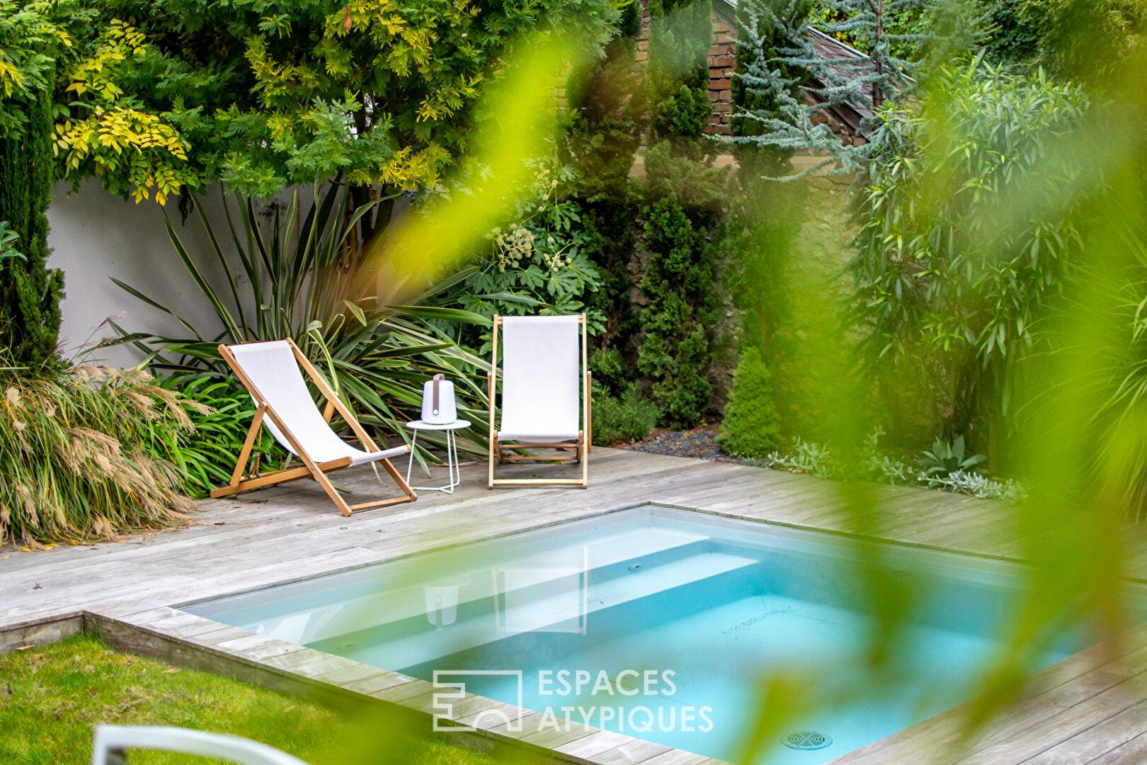 Le jardin soigneusement végétalisé forme un écrin verdoyant autour de la piscine intime, propice aux moments de calme et de convivialité.