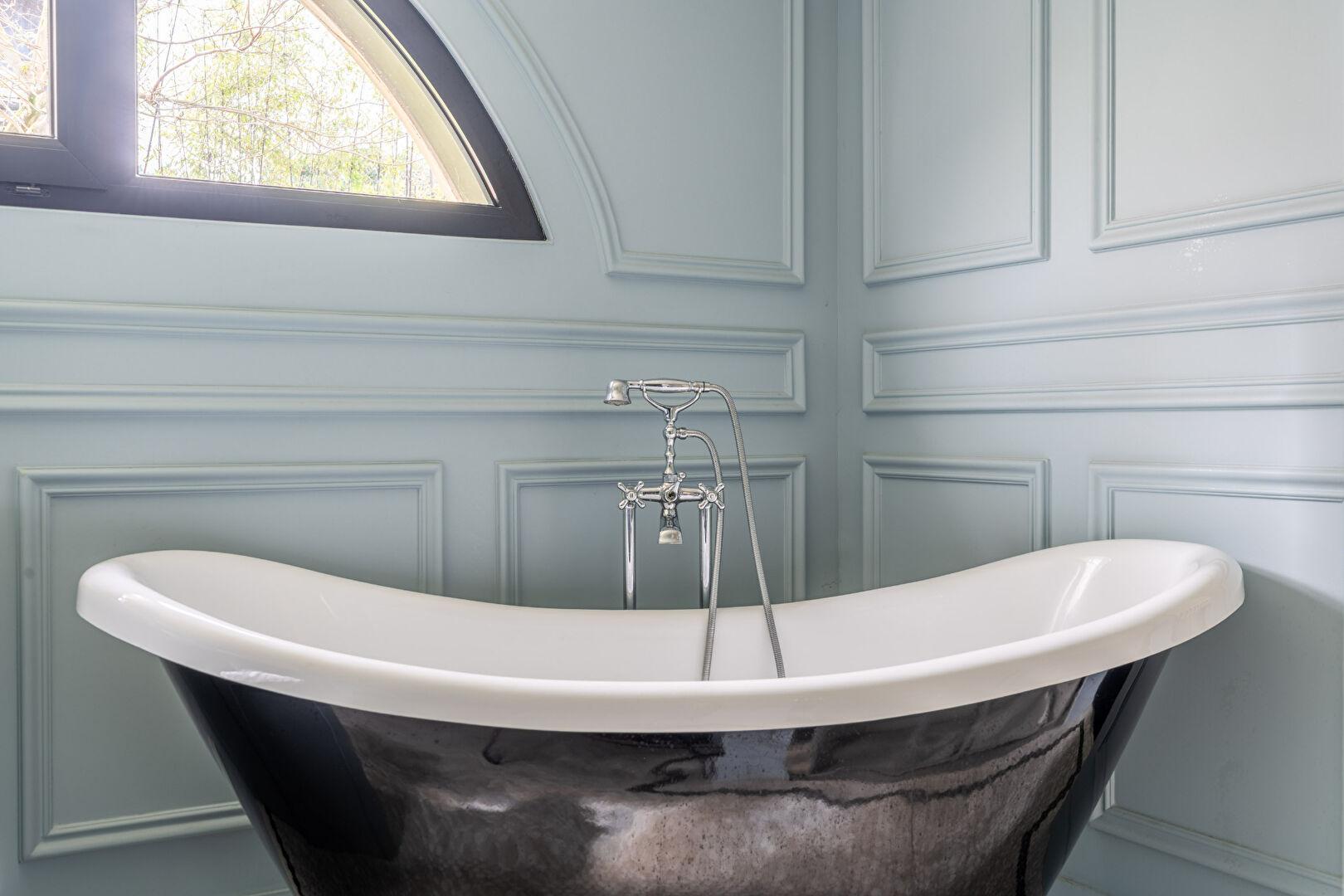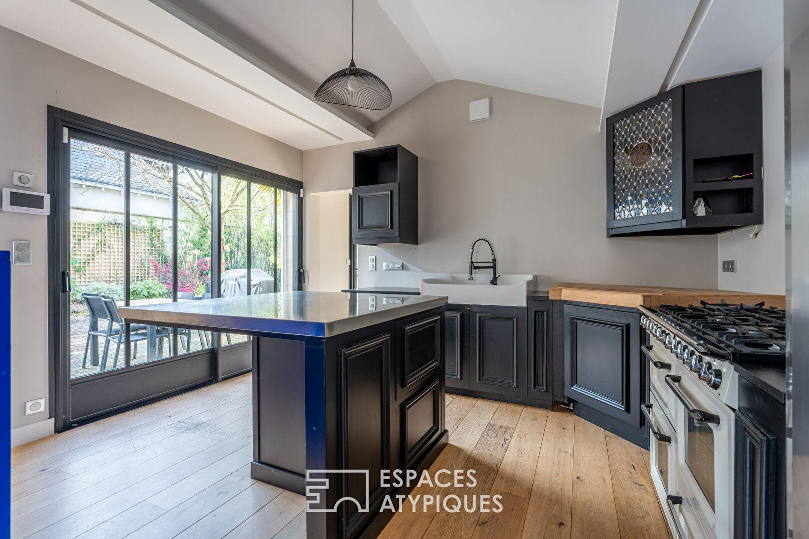 La cuisine semi-ouverte, aménagée et équipée, séduit par ses éléments au caractère affirmé tels que le piano de cuisson, le billot en bois et l’îlot central en inox, mêlant authenticité et esprit contemporain. Au rez-de-chaussée, un espace nuit propose une élégante salle de bains avec douche, ainsi qu’une chambre avec grande ouverture sur le jardin, adossée à un dressing. La décoration contemporaine, associée à des éléments anciens conservés, ainsi que la vie de plain-pied tournée vers le jardin végétalisé et sans vis-à-vis, rendent ce bien rare et privilégié. Au premier étage, deux jolies chambres avec des rangements sur mesure se partagent une petite salle d’eau.