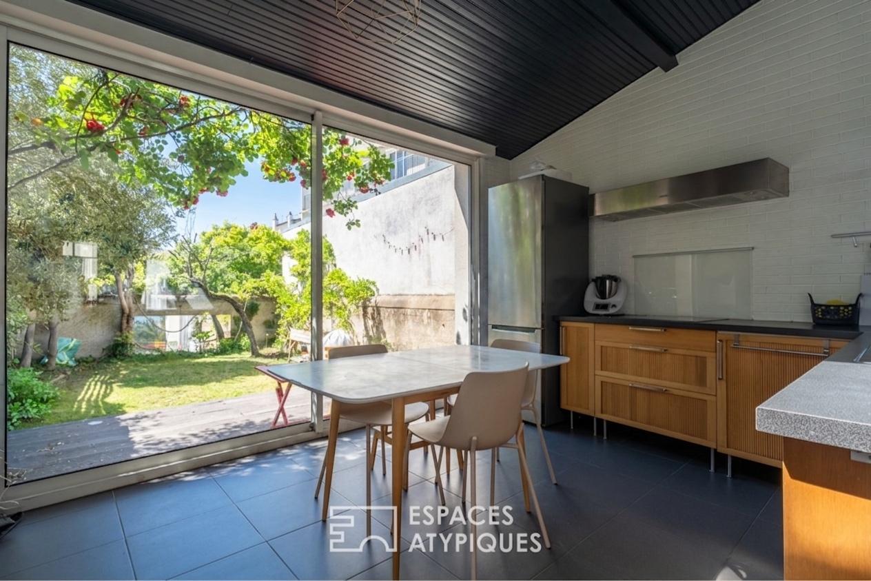 La pièce de vie traversante s’articule autour d’un salon et d’une salle à manger ouverts, formant un espace convivial prolongé par la cuisine. L’ensemble s’ouvre directement sur un jardin à l’abri des regards, véritable cocon urbain propice aux moments de détente.