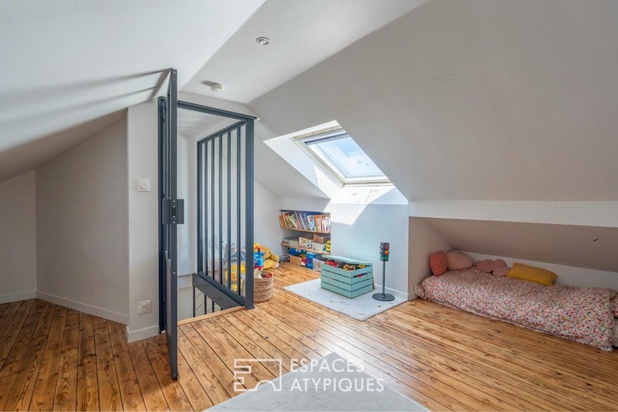Les étages distribuent harmonieusement les espaces nuit. Le premier niveau accueille deux chambres, dont une avec salle d’eau, tandis que le dernier étage dévoile une chambre sous combles, idéale pour un univers enfant, un espace de télétravail ou une chambre supplémentaire.