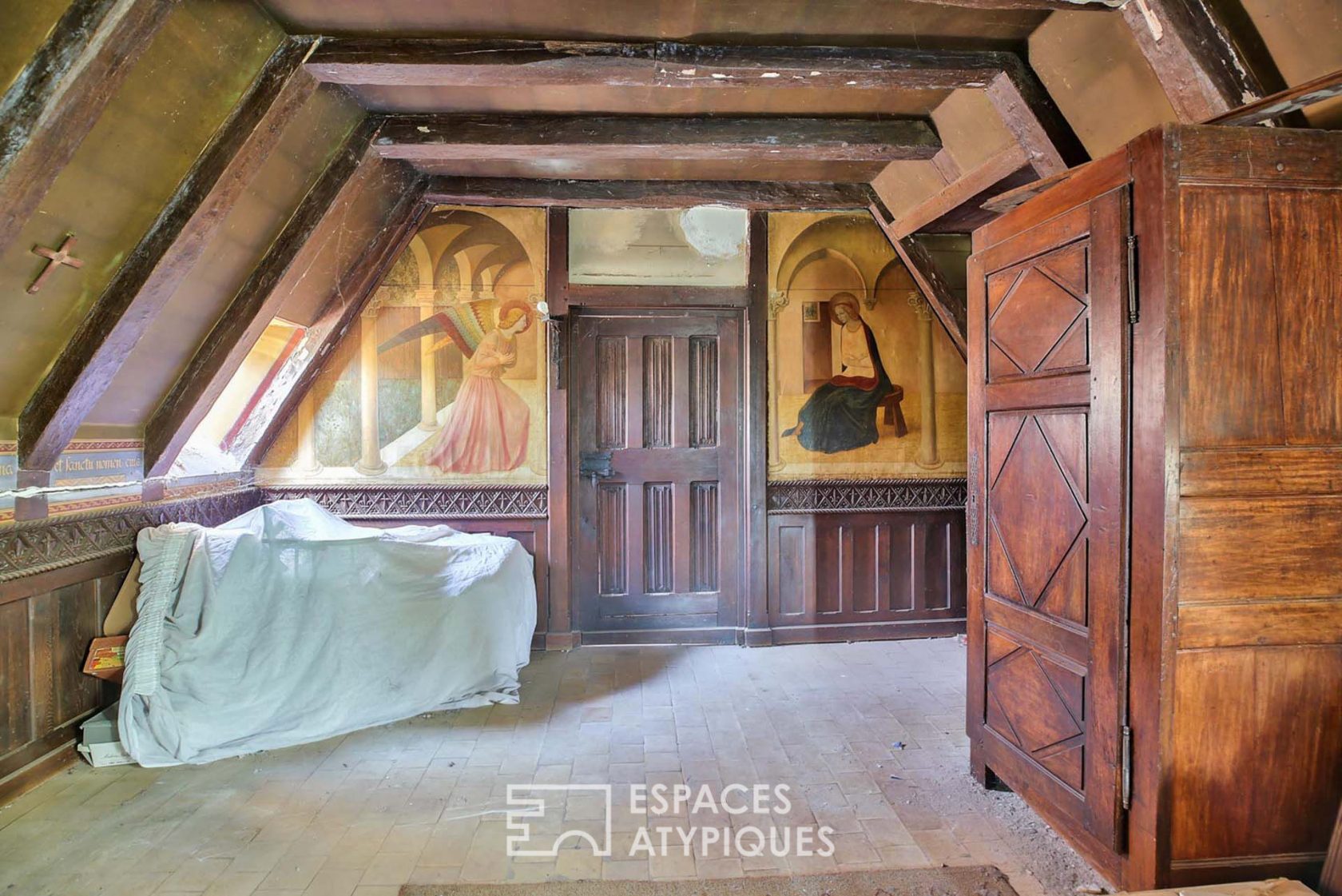 Le manoir, d’une surface de plus de 400 m² habitables, est à réinventer intérieurement. Il se compose au rez-de-chaussée de vastes pièces de vie, d’une cuisine et d’une salle de réception de 60 m² à la hauteur sous plafond vertigineuse (4m30). Le premier étage dessert 5 chambres, un salon et deux salles de bain. Dans la tour du manoir, un superbe escalier à vis en pierre permet également d’accéder au deuxième étage qui n’est autre que l’ancienne chapelle où les peintures murales et les traces du passé sont saisissantes. L’ensemble du grenier est aménageable et ajoute un véritable potentiel à cette bâtisse.