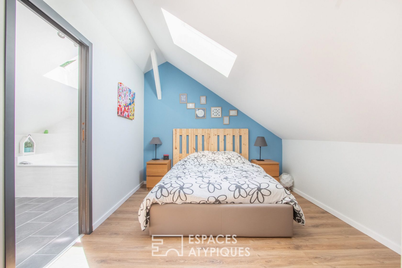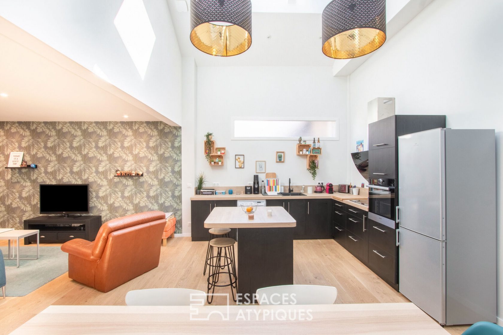 Ce bien atypique bénéficie d’une rénovation récente de 2019 et de très belles prestations, à l’image de ce grand espace de vie de 70m² au rez-de-chaussée et sa belle hauteur sous plafond. Les deux verrières à ouverture à distance apportent toute la lumière nécessaire à la maison.