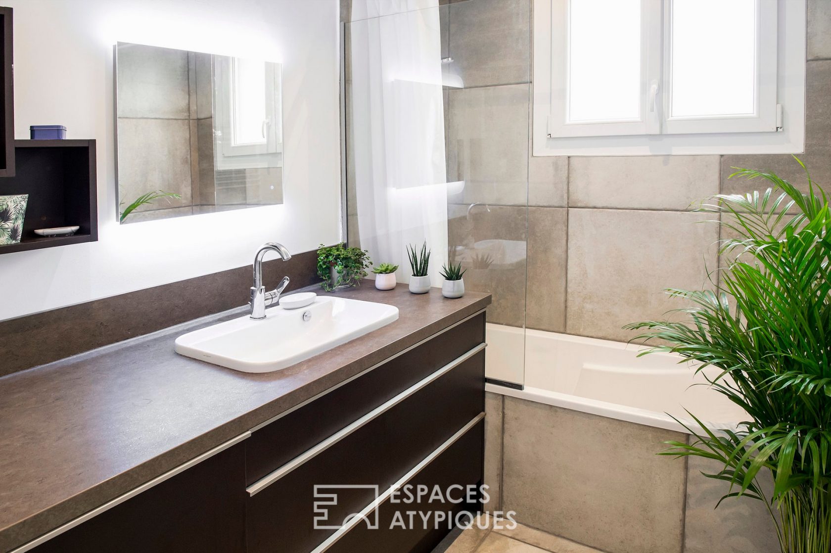 Les espaces ont été repensés pour offrir un beau volume de vie entièrement ouvert avec une cuisine résolument moderne. L’appartement a été rénové avec des matériaux de qualité se mariant habilement avec une décoration contemporaine.