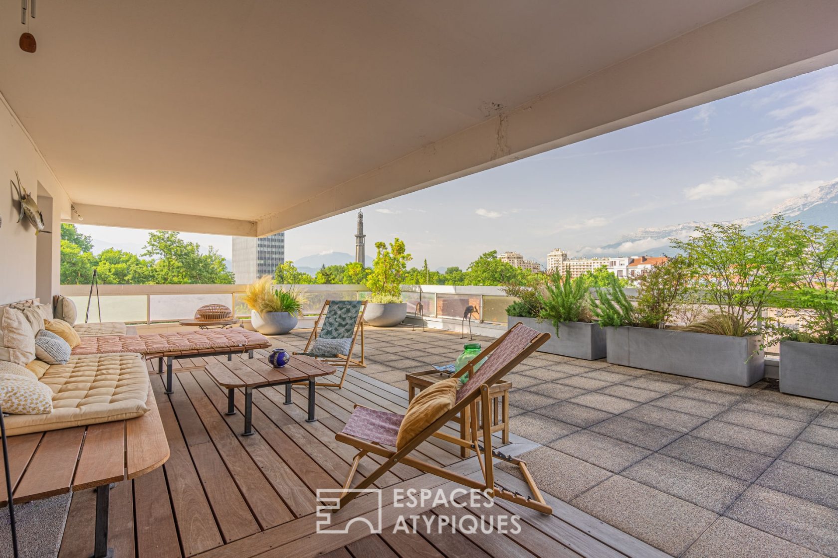 Situé à proximité du Jardin des Plantes et de la Préfecture, au 5ème étage avec ascenseur d’un immeuble de standing, cet appartement de 129 m² avec sa terrasse de 115 m² offre une triple exposition et une vue imprenable sur la ville et les trois massifs montagneux.