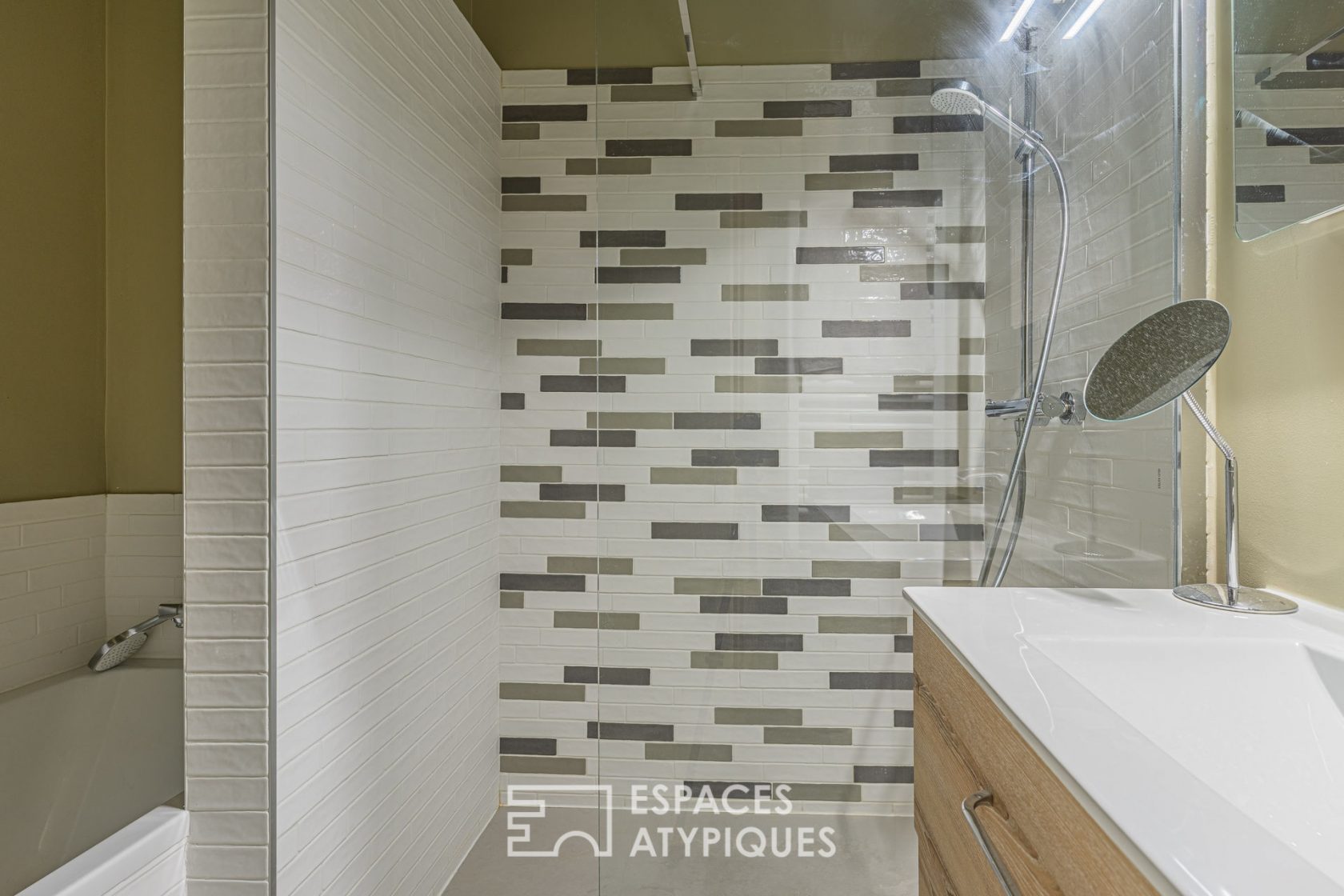 L’appartement a été entièrement repensé par un architecte et offre des volumes et une atmosphère empreinte de bois et de tons chauds. Un magnifique vitrail ajoute à ce lieu un caractère d’exception et des jeux de couleurs entre la cuisine et la salle d’eau parentale.