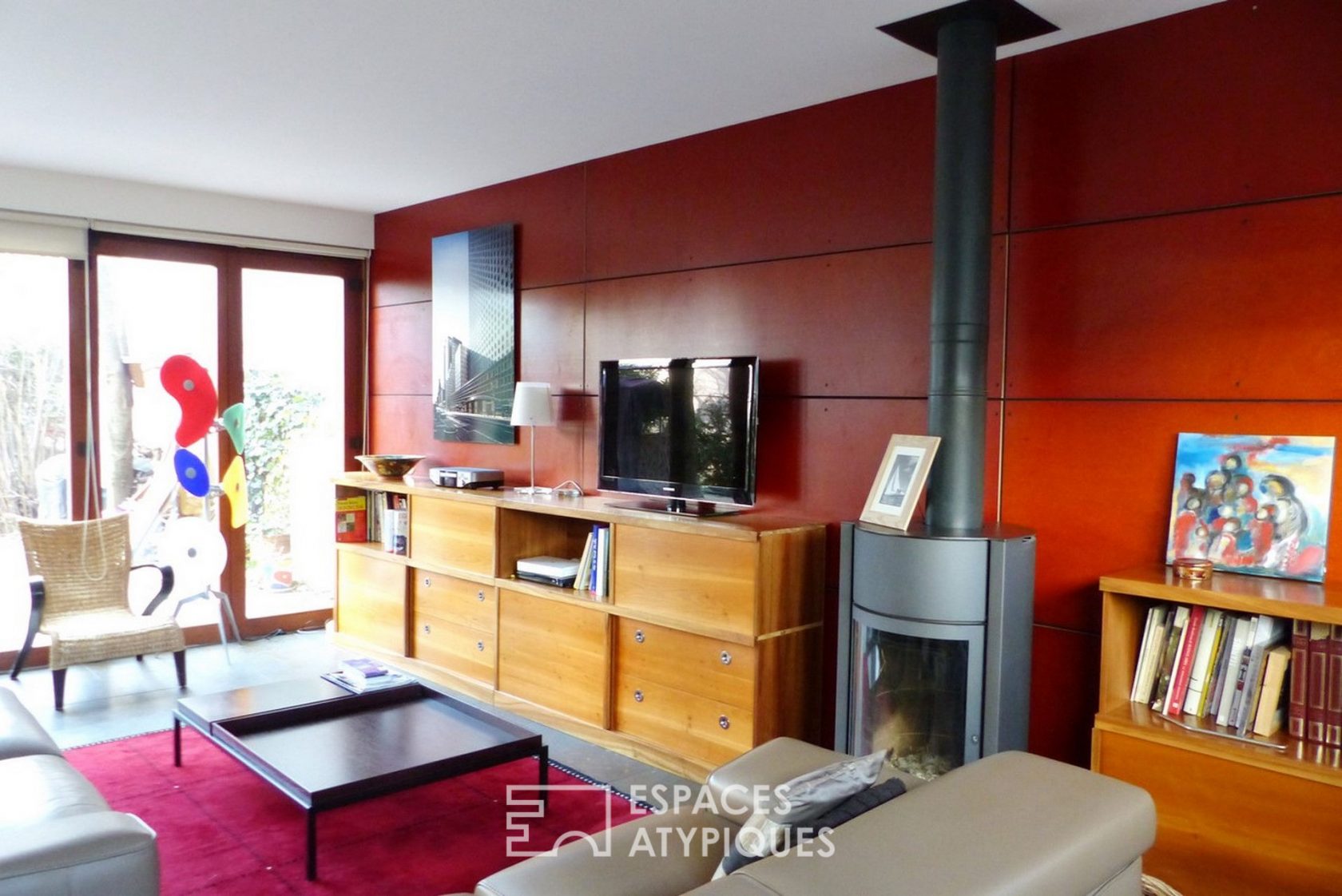 Située dans le quartier prisé de l’Ile verte , cette maison d’architecte de 190m² en triplex bénéficie de lignes résolument contemporaines avec sa toiture courbe en zinc, ses façades bardées en bois ,ses vêtures céramiques et ses grandes baies vitrées. Érigée sur un terrain de 360m², l’extérieur comprend un jardin clos et arboré ainsi qu’une terrasse bois d’environ 60 m². La vaste pièce à vivre de l’habitation se compose d’un salon organisé devant le poêle à bois., d’une jolie cuisine ouverte entièrement aménagée et d’un espace salle-à-manger. Les baies vitrées (repliables pour la saison estivale) de cette pièce ouvrent sur une belle terrasse en ipé qui surplombe le jardin, Une buanderie et un wc complètent le niveau du rez de chaussée. L’étage desservi par un escalier de couleur blanche comprend une zone bureau aux volumes généreux avec vue directe sur le massif de Chartreuse, une chambre avec salle d’eau et une suite parentale avec salle d’eau, dressing , wc . Les combles qui épousent les courbes de toiture sont accessibles par un escalier et une passerelle dans la hauteur du puit de lumière .Ce niveau comprend trois chambres dont une avec dressing .Une salle d’eau est dédiée pour cet étage. Le chauffage gaz est individuel par chaudière à condensation ( résilles au sol pour le niveau bas et radiateurs pour les étages) . La maison est climatisée . Les prestations haut de gamme , l’architecture contemporaine, le jardin et sa localisation privilégiée en font un lieu de vie exceptionnel . Contact: Xavier- 06 87 01 22 45
