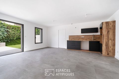 L’extérieur s’articule autour d’une terrasse pour accueillir famille et amis de manière conviviale tout en bénéficiant d’un entretien limité au niveau des espaces verts . Une piscine ou un spa de nage est notamment envisageable pour les plus chaudes journées d’été.