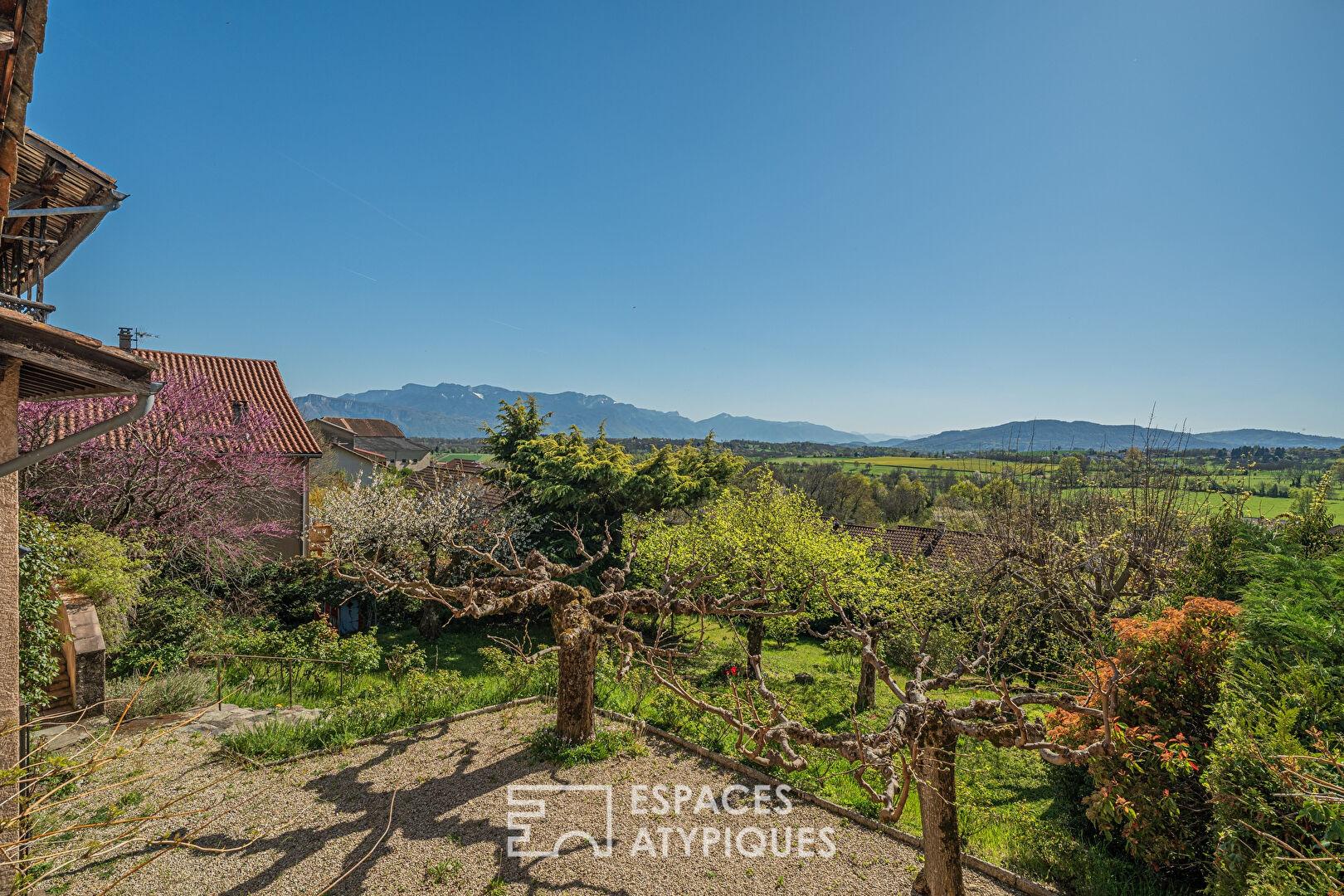 À l’extérieur, le jardin arboré invite à la contemplation. Une terrasse exposée plein sud offre une vue dégagée sur la campagne environnante, tandis que le terrain en pente douce, agrémenté d’un puits ancien, permet d’envisager un potager, une piscine ou tout autre aménagement paysager.