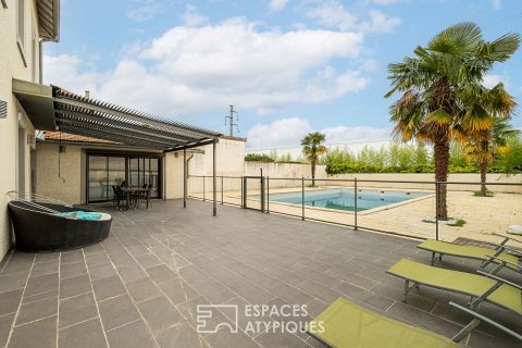 L’entrée ouvre sur une vaste pièce de vie comprenant une cuisine entièrement équipée, semi-ouverte sur un séjour avec salle à manger et salon. L’espace se prolonge par une terrasse agrémentée d’une pergola et d’une piscine de 10×15 m, idéale pour profiter des journées ensoleillées.