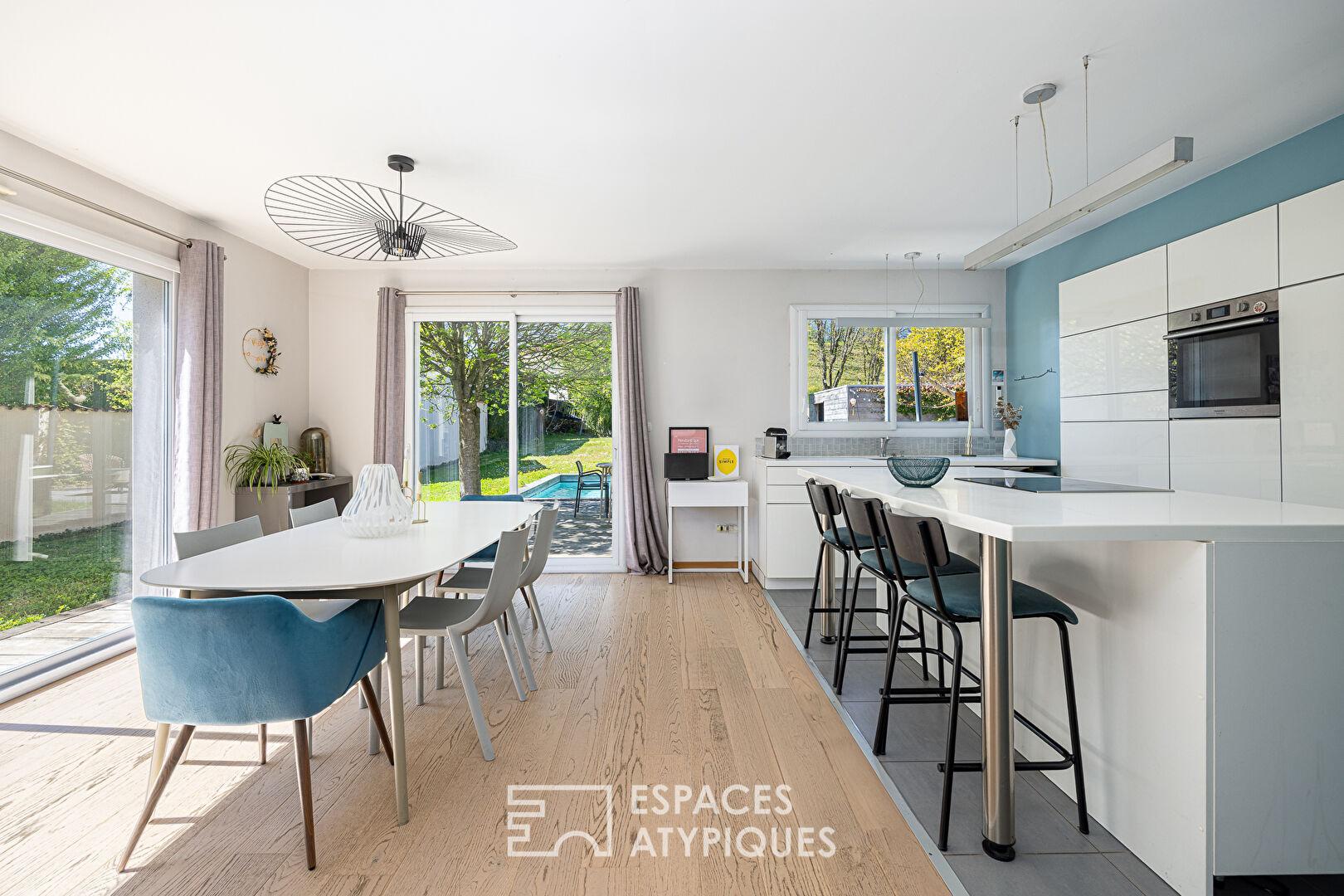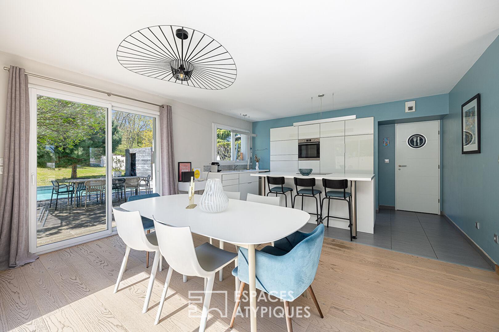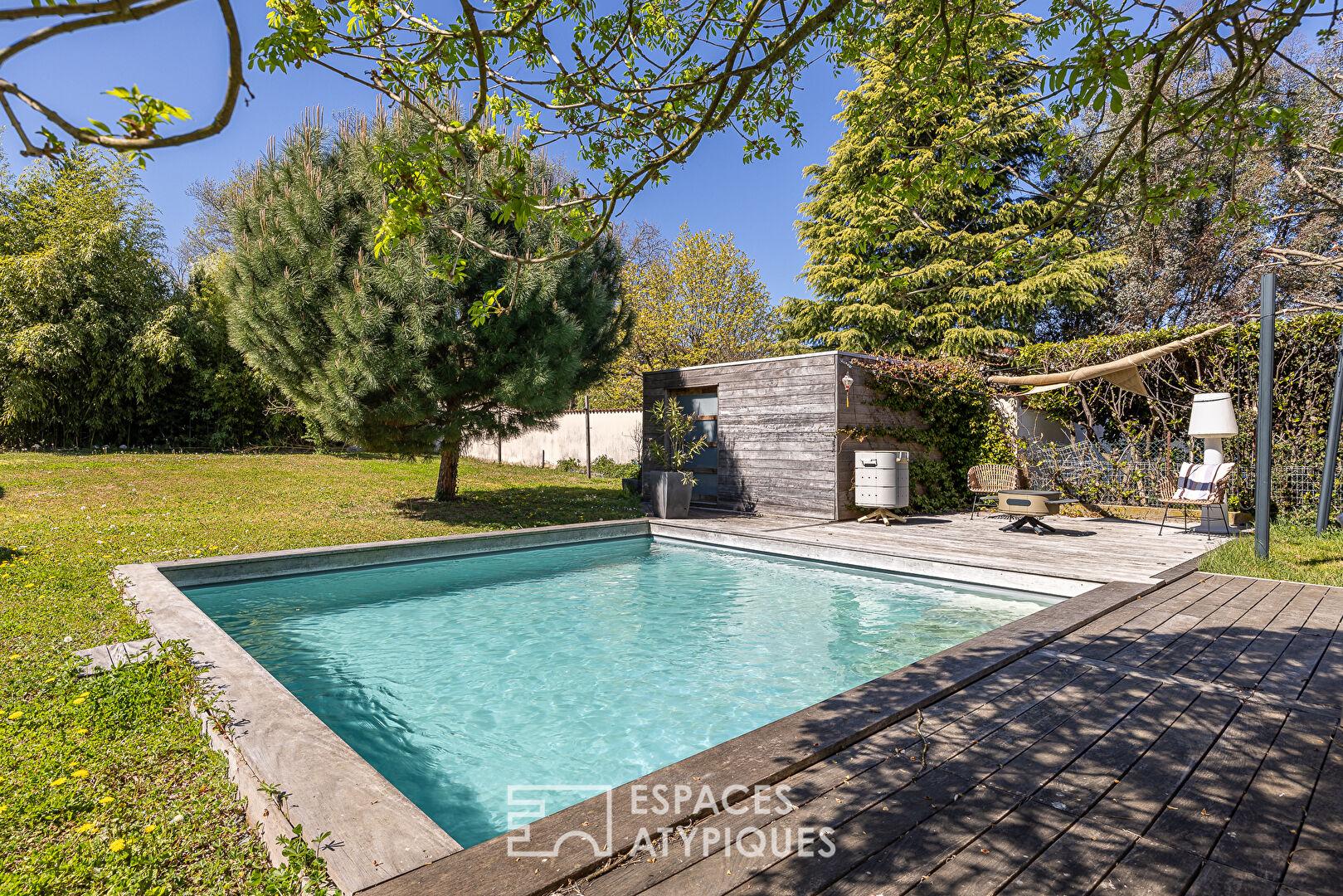 La terrasse en bois prolonge naturellement le séjour et borde une piscine aux reflets azur, parfaitement intégrée au paysage.