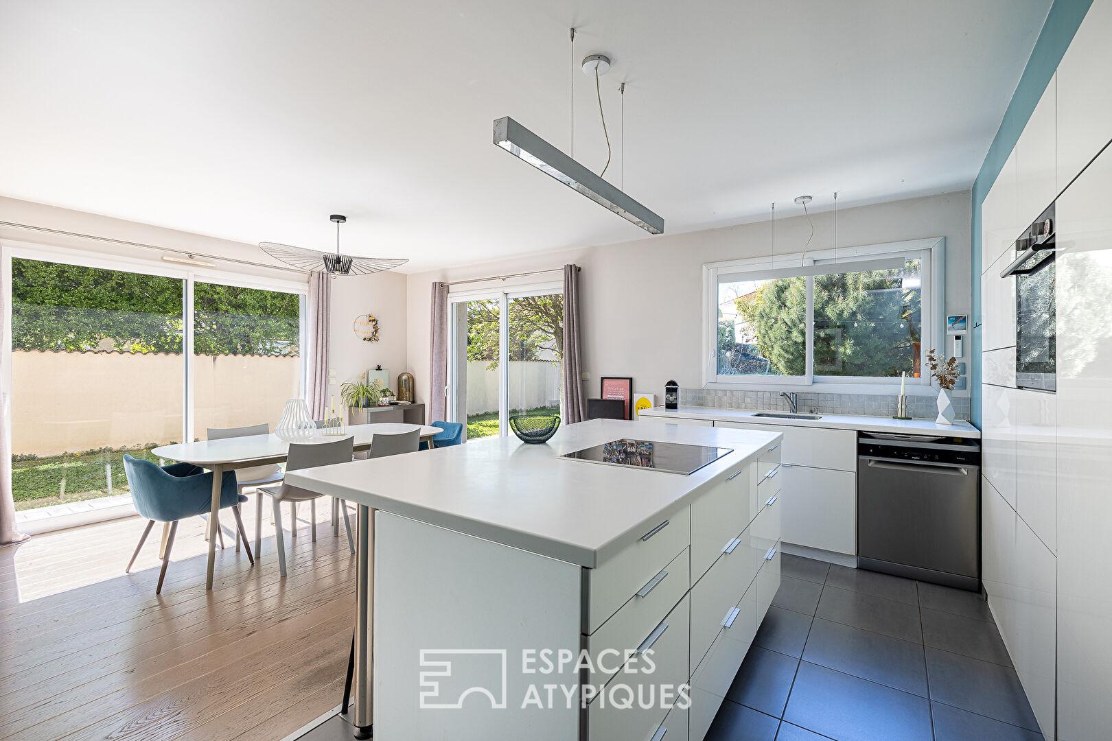 L’intérieur se dévoile à travers une vaste pièce de vie baignée de lumière, où le salon, réchauffé par une cheminée, invite à la sérénité. La transition vers l’espace dînatoire est fluide, soulignée par une cuisine ouverte au design immaculé et son îlot central convivial. L’architecture intérieure privilégie la fonctionnalité avec une suite parentale de plain-pied, offrant une autonomie totale au rez-de-chaussée.