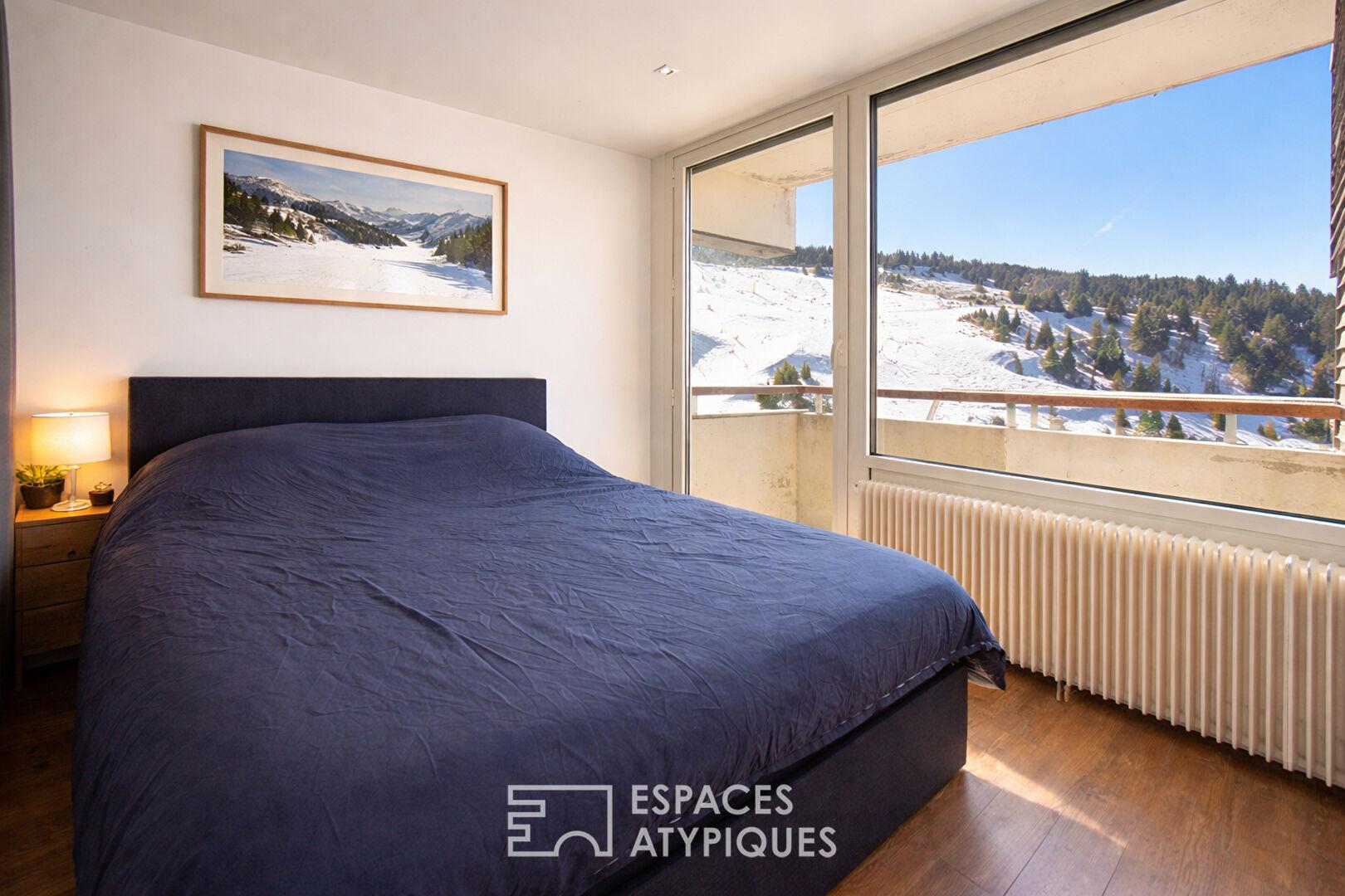 L’intérieur, repensé avec une écriture contemporaine, déploie une atmosphère chaleureuse où chaque volume est optimisé pour une véritable sensation de bien-être. La pièce de vie, lumineuse et épurée, s’ouvre sur deux balcons offrant un panorama saisissant qui embrasse les pistes, les sommets du Vercors oùu chaque coucher de soleil devient un spectacle incroyable.