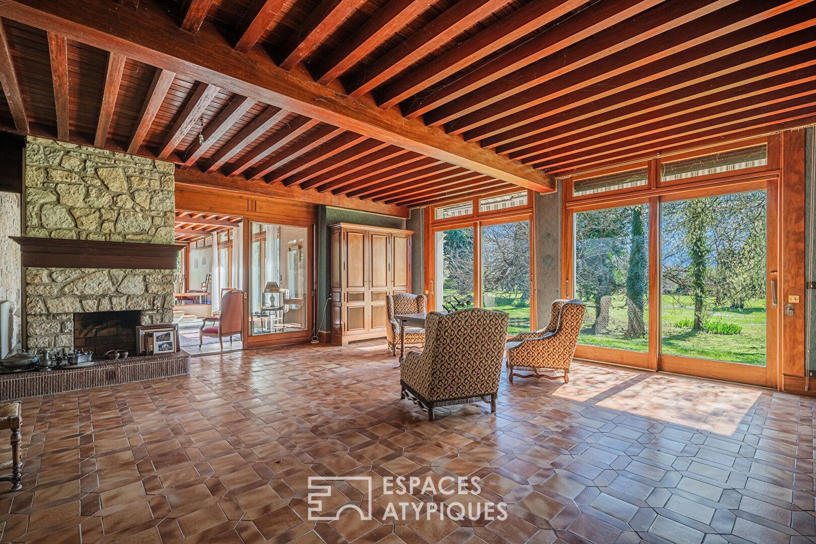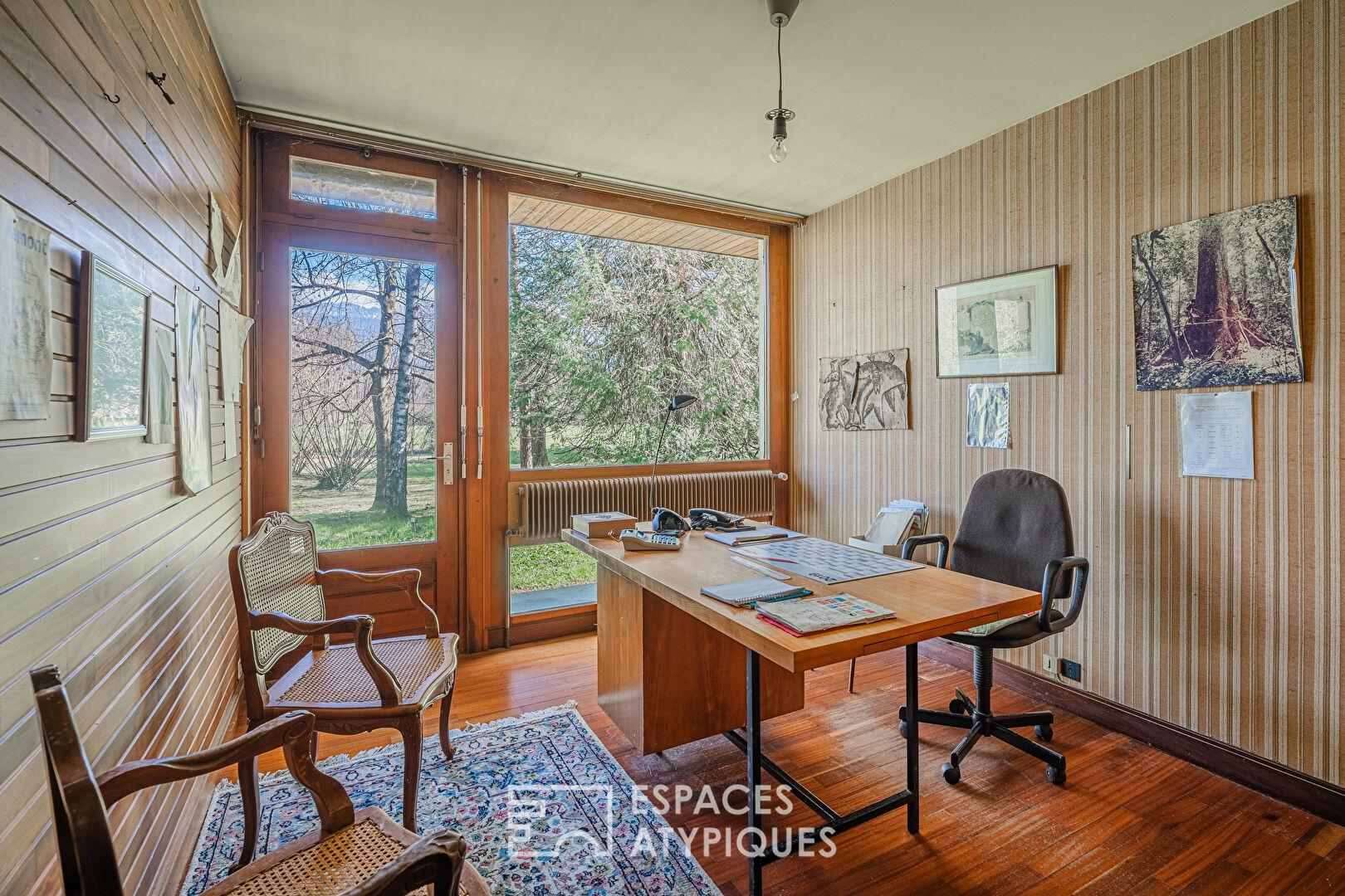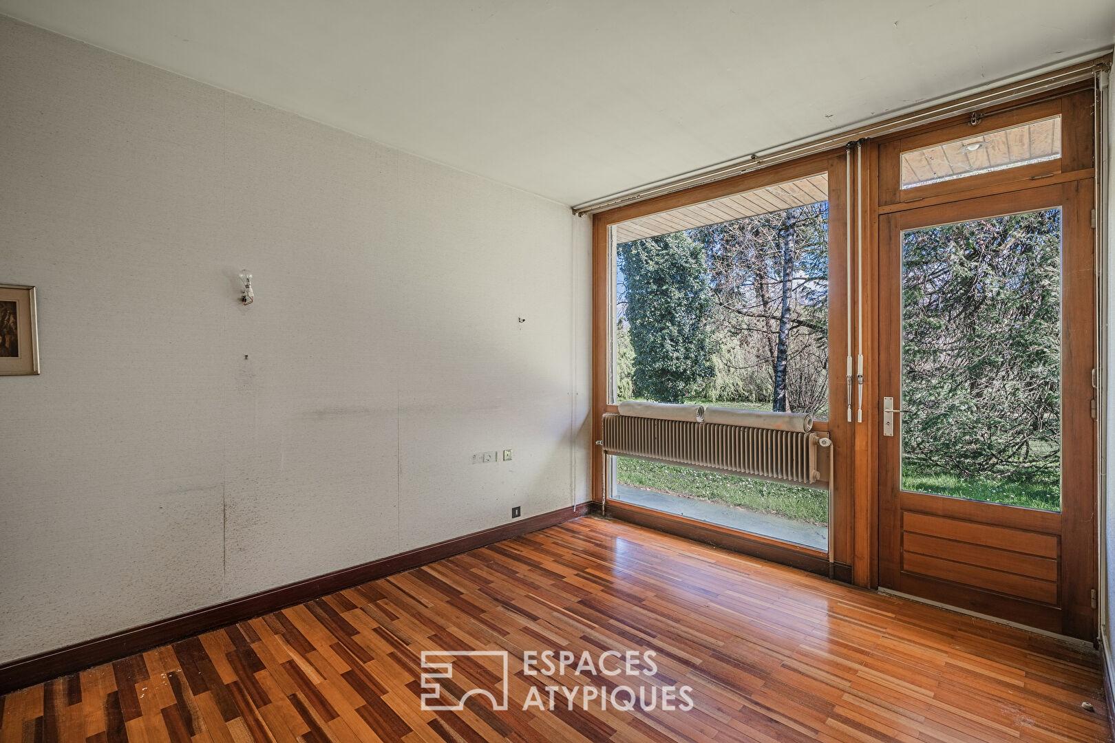 Située aux abords de la plaine de Moirans, cette propriété de caractère de 1965 déploie ses volumes généreux sur un parc paysagé d’exception. Issue d’une architecture remarquable magnifiée par sa surélévation deux ans plus tard, cette maison d’architecte s’inscrit dans les codes de l’immobilier atypique de par sa silhouette singulière et son implantation privilégiée.