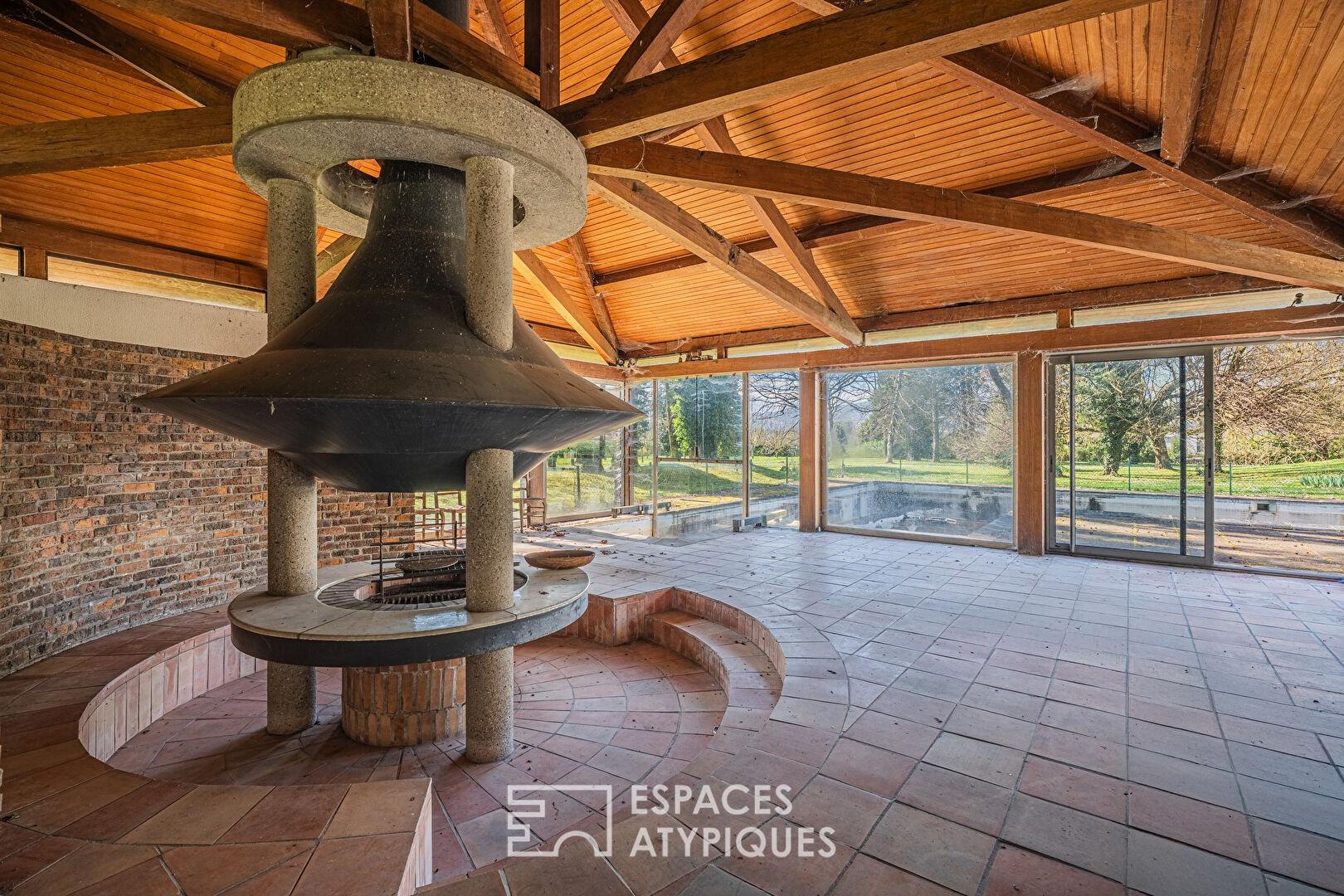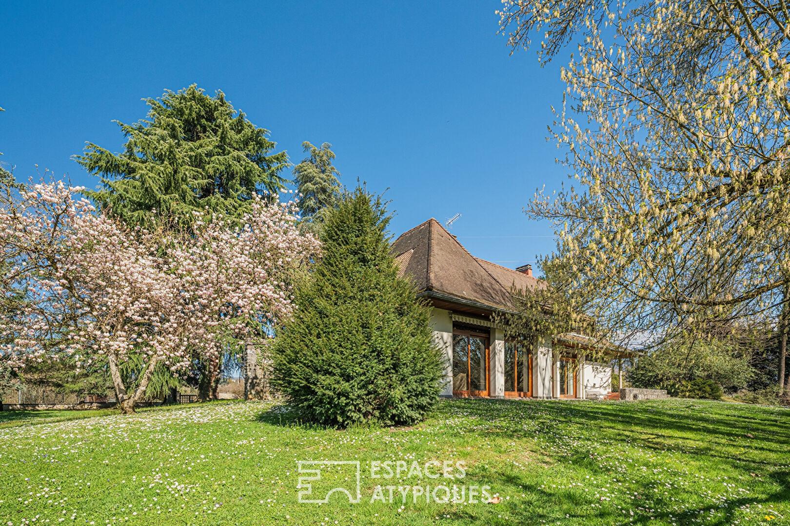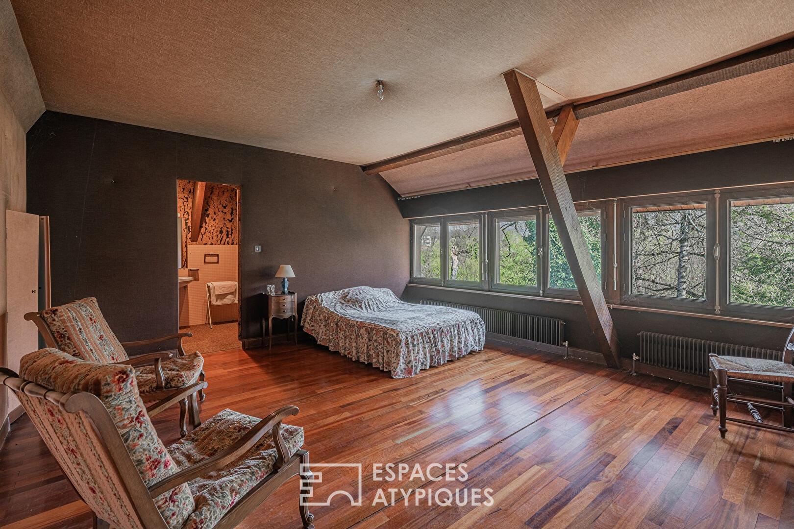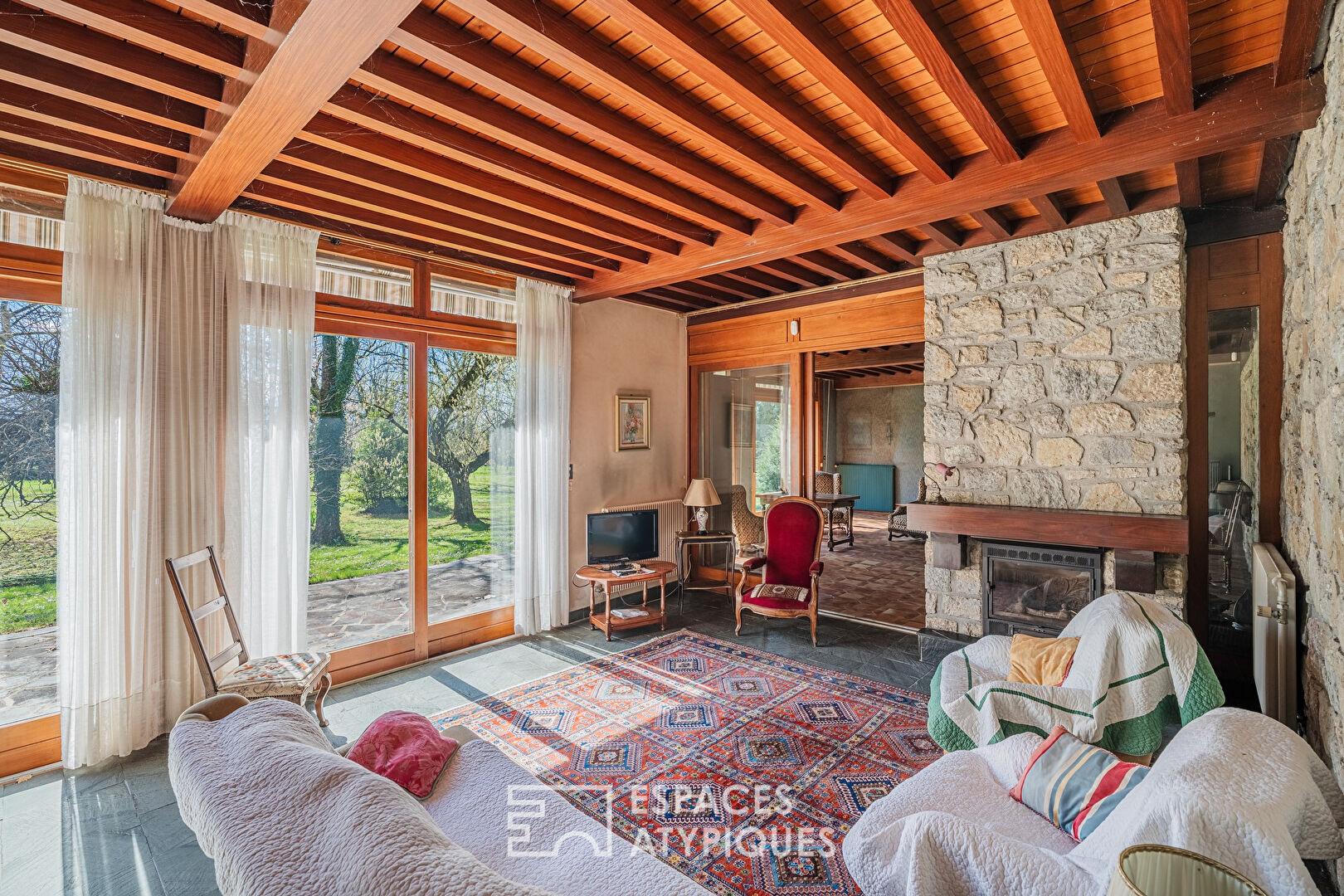 Située aux abords de la plaine de Moirans, cette propriété de caractère de 1965 déploie ses volumes généreux sur un parc paysagé d’exception. Issue d’une architecture remarquable magnifiée par sa surélévation deux ans plus tard, cette maison d’architecte s’inscrit dans les codes de l’immobilier atypique de par sa silhouette singulière et son implantation privilégiée.