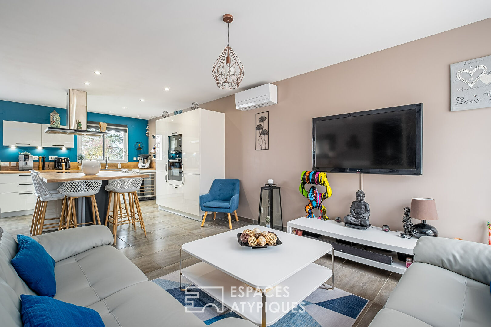 Située sur la commune de Leyrieu, cette magnifique maison chaleureuse et moderne, est idéalement située à seulement 10 minutes des grands centres commerciaux de Tignieu Jameyzieu.